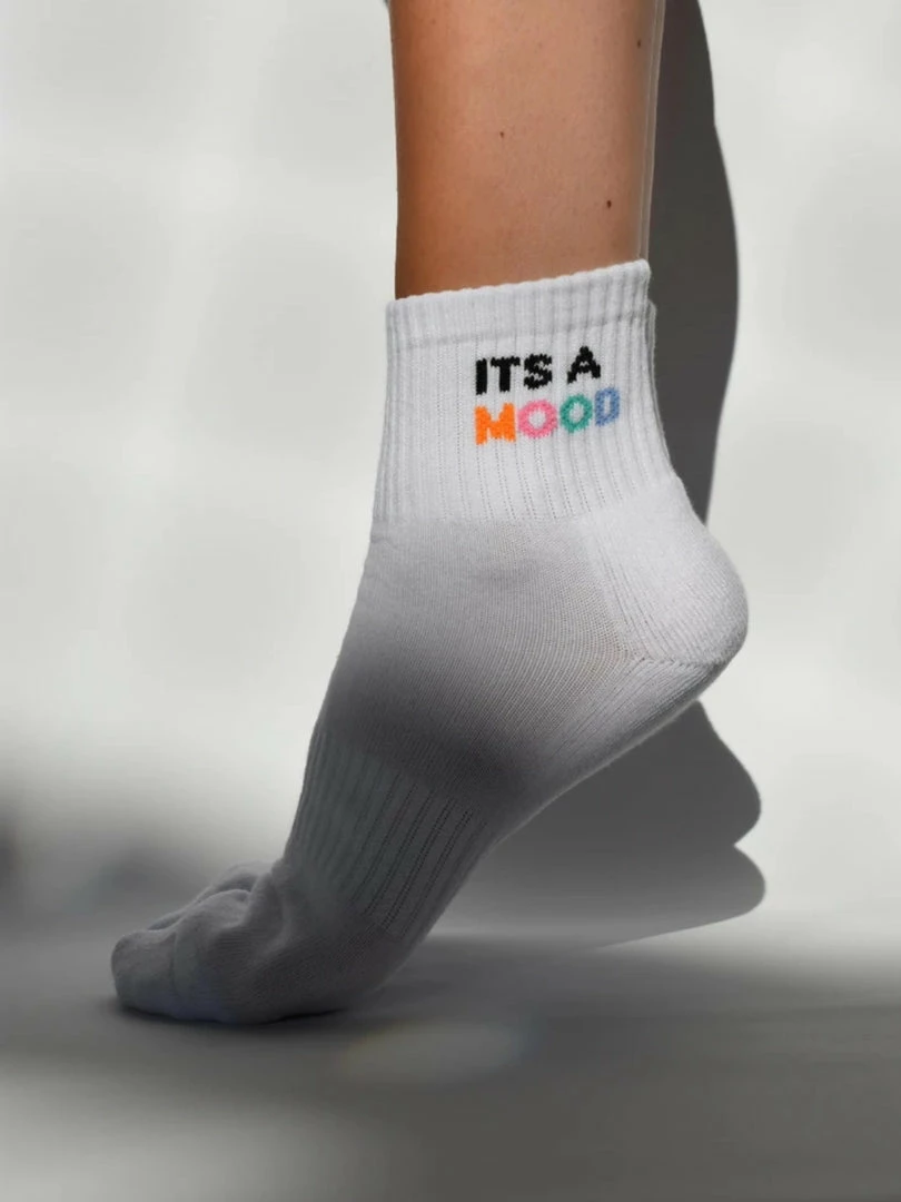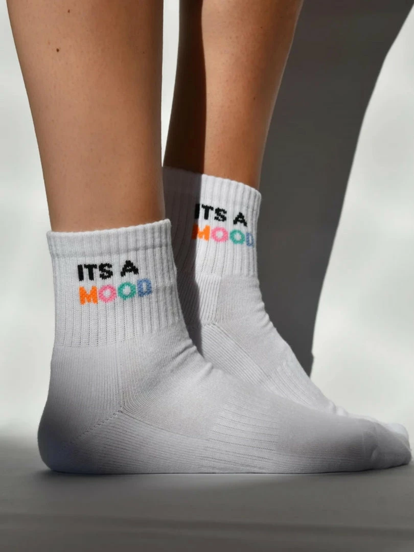 Soxygen white ‘Its A Mood’ ankle socks featuring a cushioned heel and toe, arch support, a brand logo on the sole, a black and multicoloured ‘Its A Mood’ slogan on the sides and a ribbed design. Unisex style. Item is One Size.