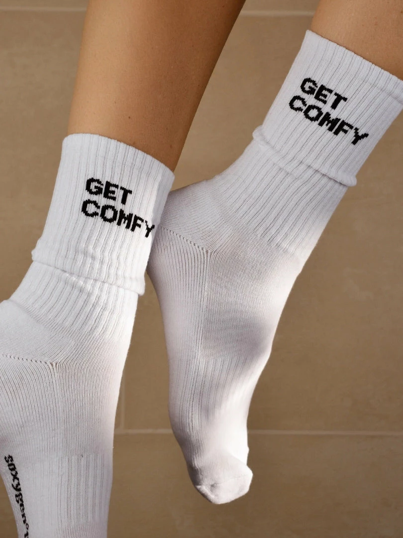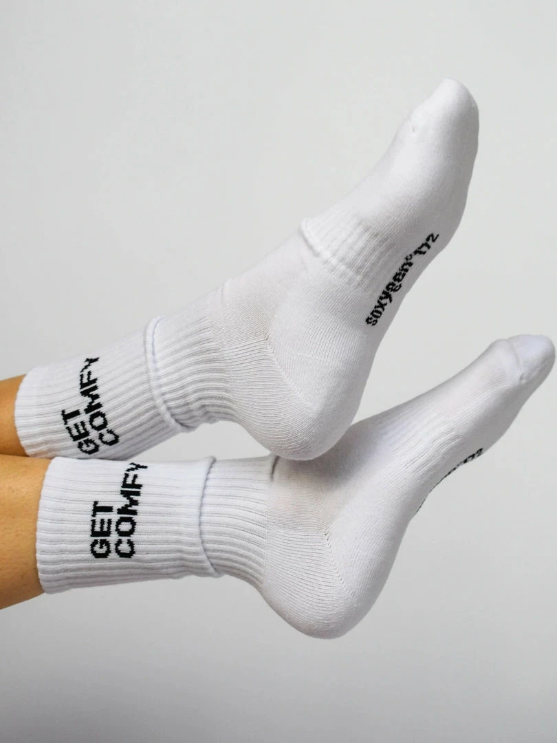 Soxygen white ‘Get Comfy’ classic socks featuring a cushioned heel and toe, arch support, a brand logo on the sole, a black ‘Get Comfy’ slogan on the sides and a ribbed design. Unisex style. Item is One Size.