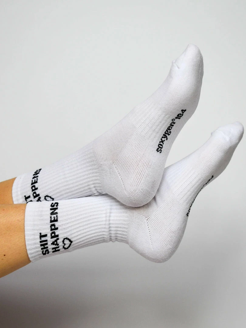Soxygen unisex white ‘Shit Happens’ classic socks featuring a cushioned heel and toe, arch support, a brand logo on the sole, a black ‘You Got This’ slogan and love heart on the sides and a ribbed design. Item is One Size.