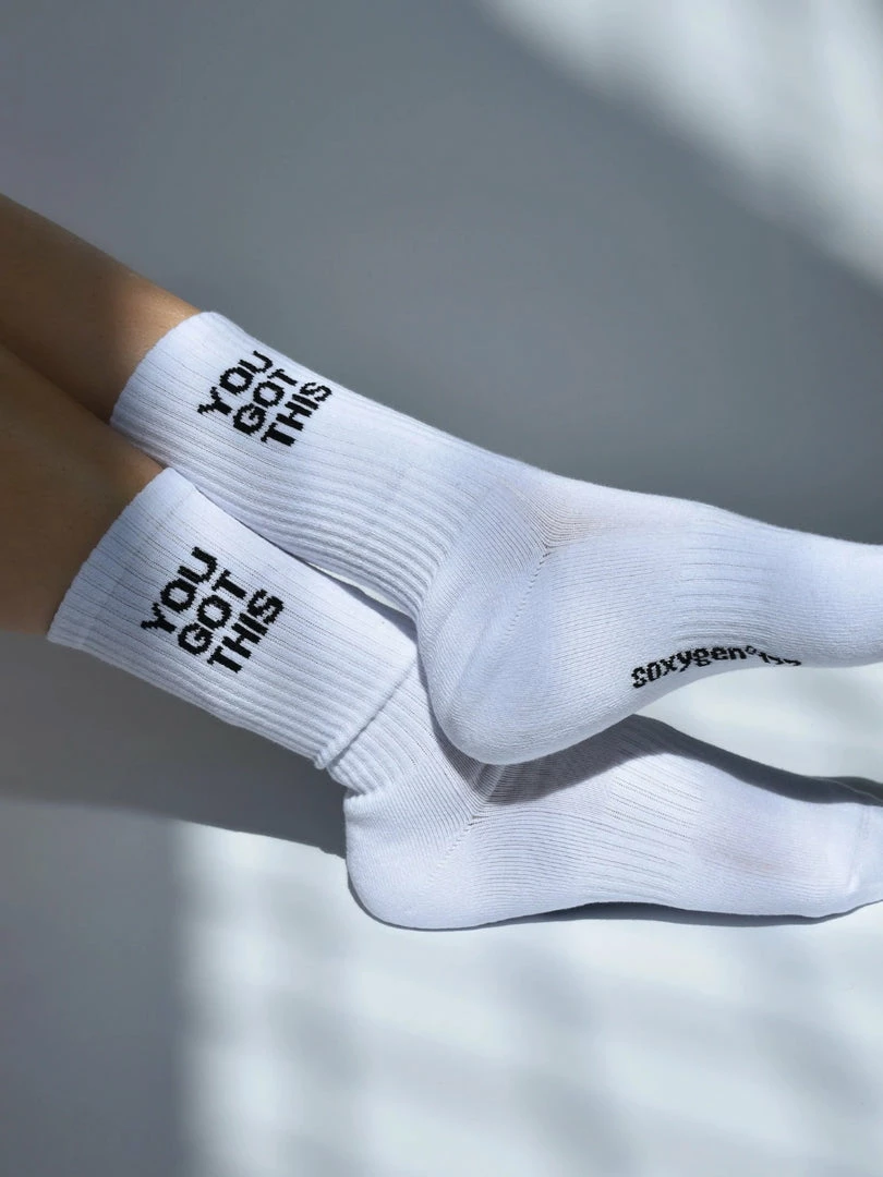 Soxygen white ‘You Got This’ classic socks featuring a cushioned heel and toe, arch support, a brand logo on the sole, a black ‘You Got This’ slogan on the sides and a ribbed design. Unisex style. Item is One Size.