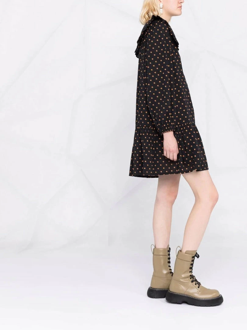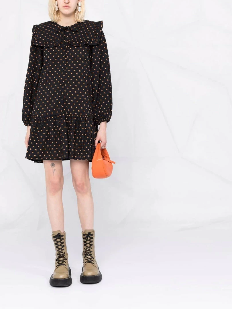 Stella Nova black ‘Charlie’ ditsy floral mini dress featuring an oversized square collar with ruffled trimming, front tie and button fastenings, long sleeves with elasticated cuffs, a ruffled skirt hemline, an orange ditsy floral print, a relaxed fit and a short length. Item fits true to size. Model is wearing a size 36 DE/DK.Â