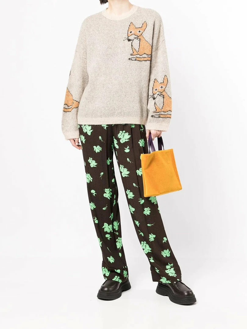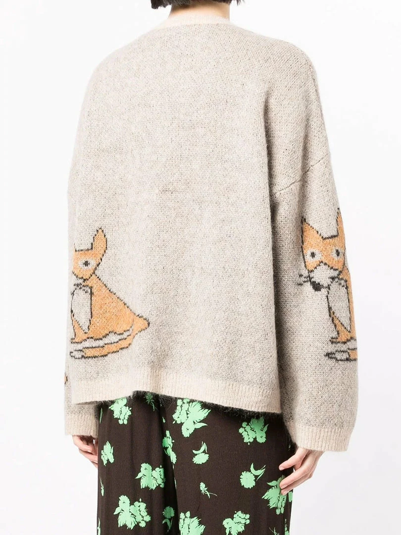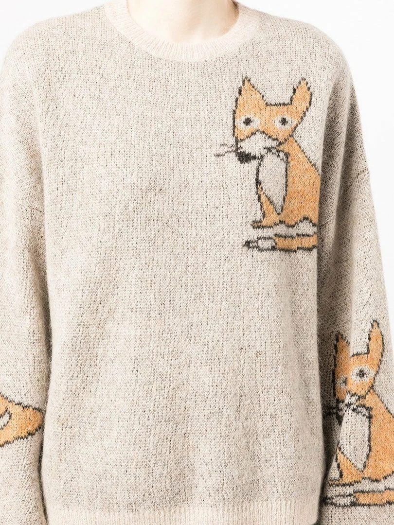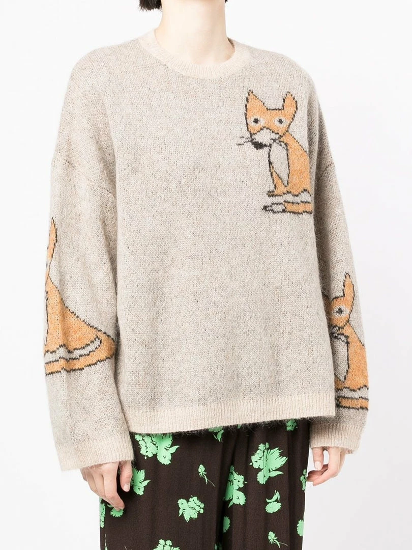 Stella Nova beige ‘Adelin’ fox sweater featuring a crew neckline, dropped shoulders, long sleeves, orange fox details, a boxy fit and pulls on. Item is slightly oversized. Model is wearing a size S.Â