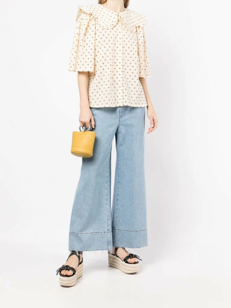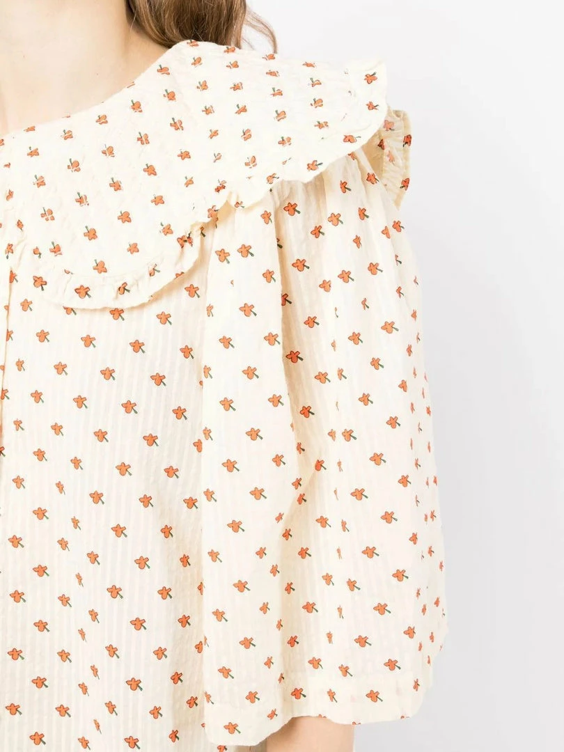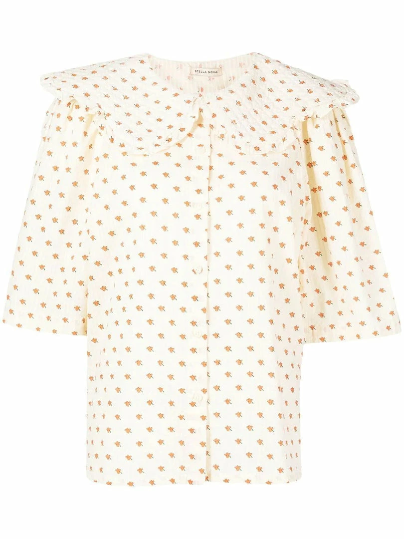 Stella Nova cream ‘Dicte’ ditsy floral shirt featuring an oversized scalloped collar with ruffled trimming, front button fastenings, short bell sleeves, side slits, a curved hemline, an orange ditsy floral print and a relaxed fit. Item fits true to size. Model is wearing a size 36 DE/DK.Â