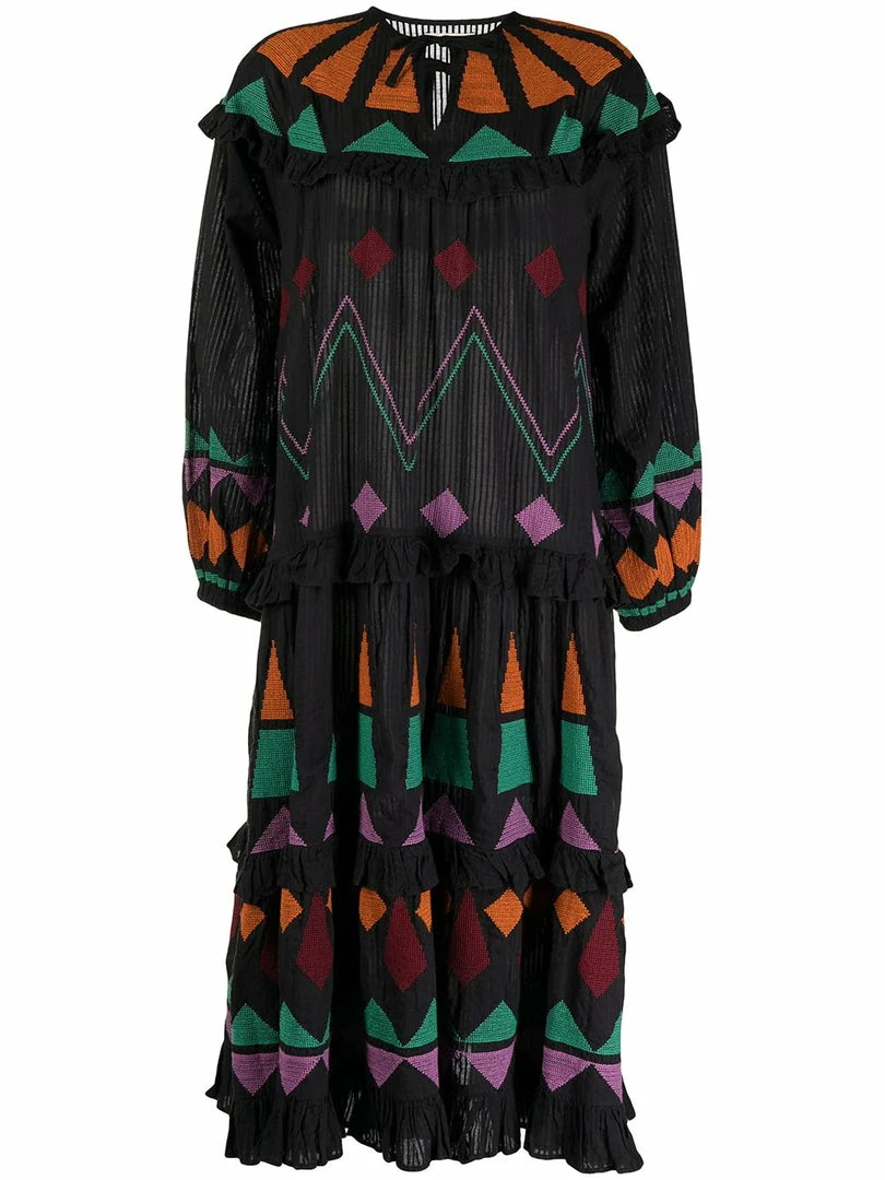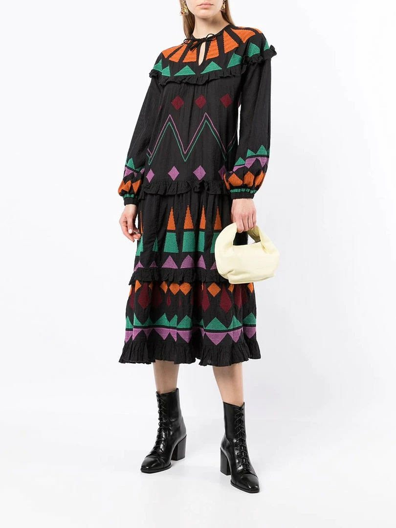Stella Nova dark navy ‘Esther’ block embroidered midi dress featuring a round neckline with a front tie fastening, long sleeves with elasticated cuffs, a tiered skirt, ruffle trimming, a subtle sheer stripe print, multicoloured cross stitch embroidered geometric shape details, a relaxed style, a midi length and pulls on. Item fits true to size. Model is wearing a size 38 DE/DK.Â
