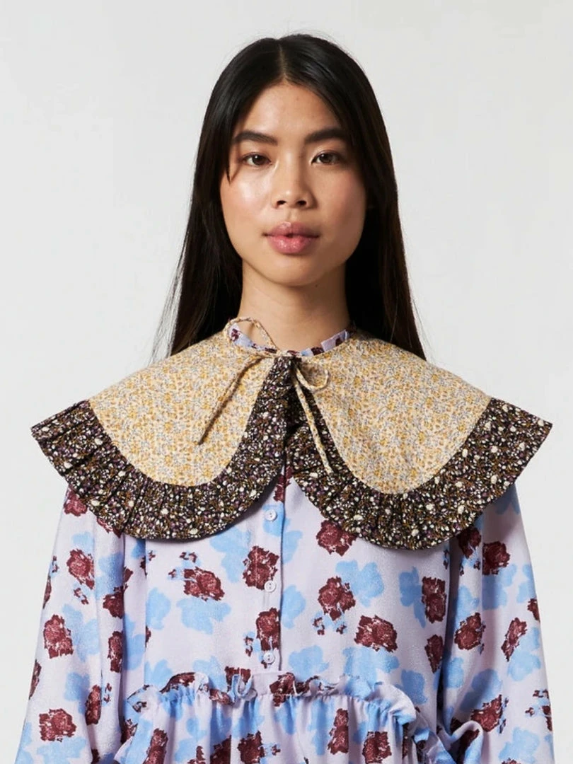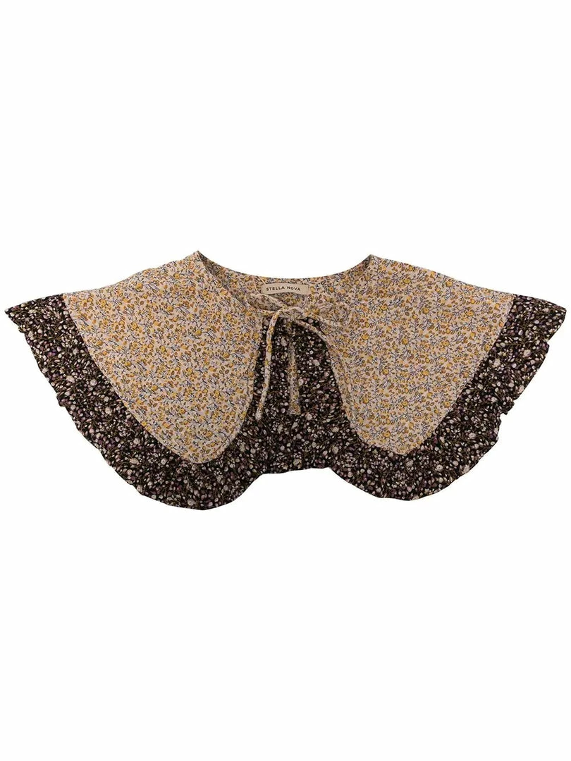 Stella Nova ‘Inez’ floral collar featuring a tie front fastening, a yellow floral curved shape, contrasting black and purple floral ruffle trimming and an oversized style. Item is One Size. Made in India.Â