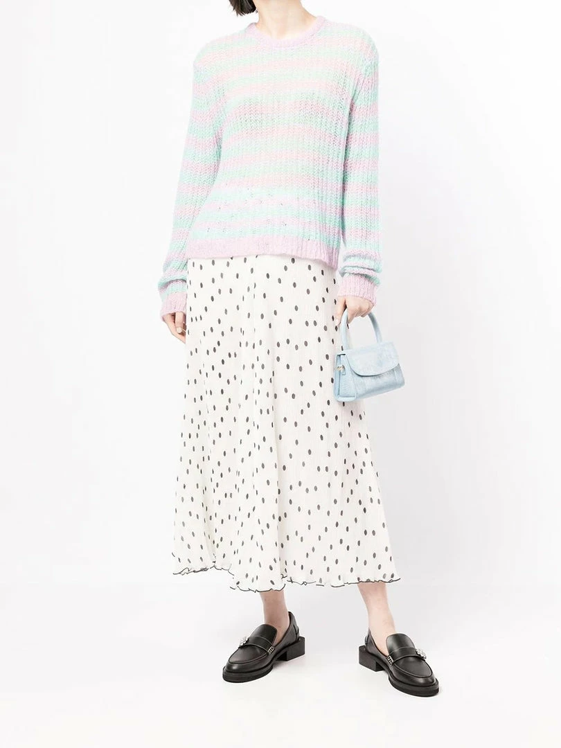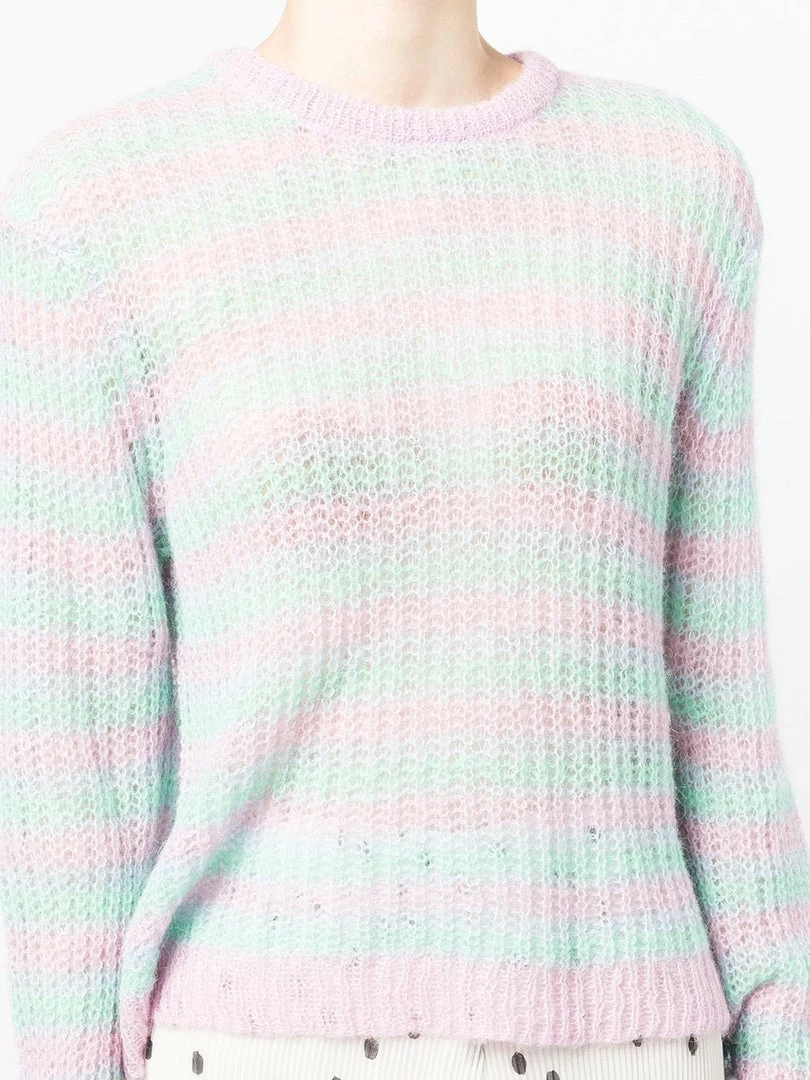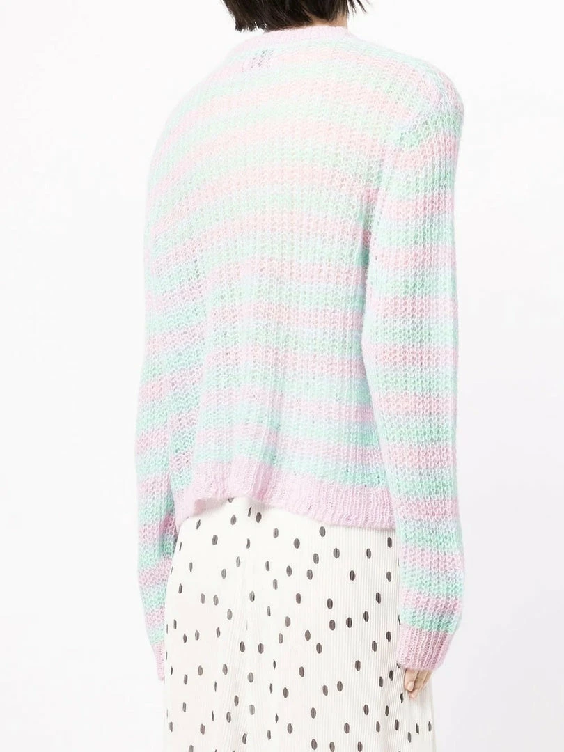Stella Nova ‘Rima Joe’ pastel stripe sweater featuring a crew neckline, long sleeves, a blue, pink and green stripe knit and pulls on. Item fits true to size. Model is wearing a size S.Â