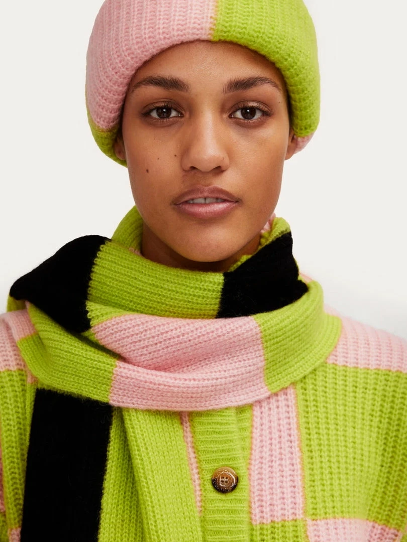Stine Goya ‘Orphea’ check scarf featuring a ribbed knit and a green, pink and black check print. Item is One Size. Made in China.Â
