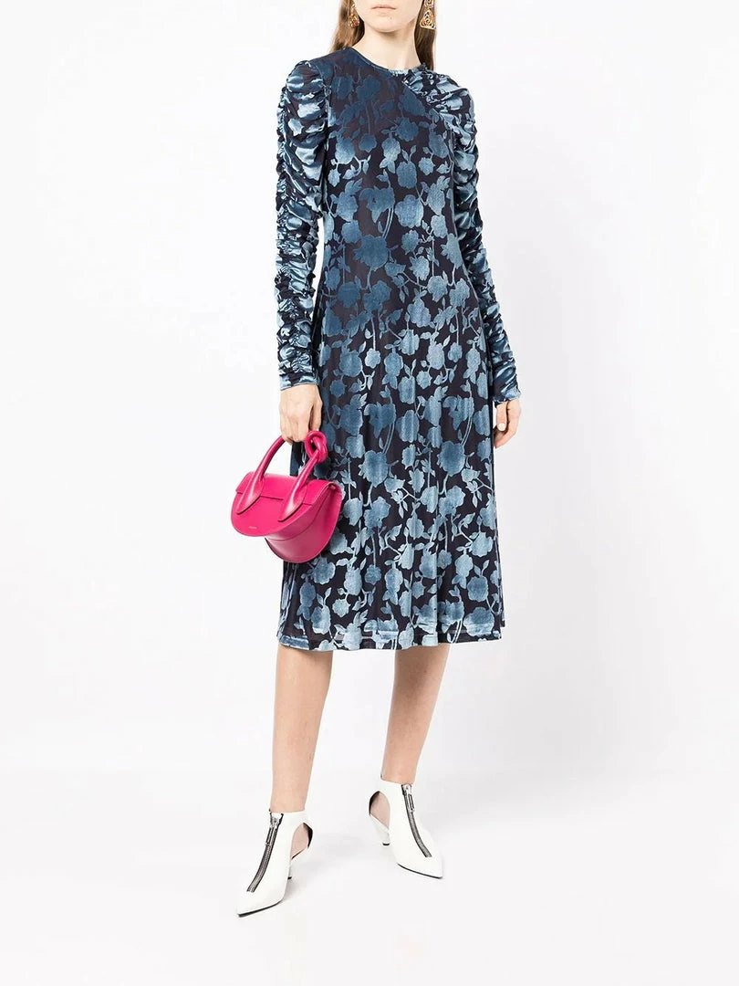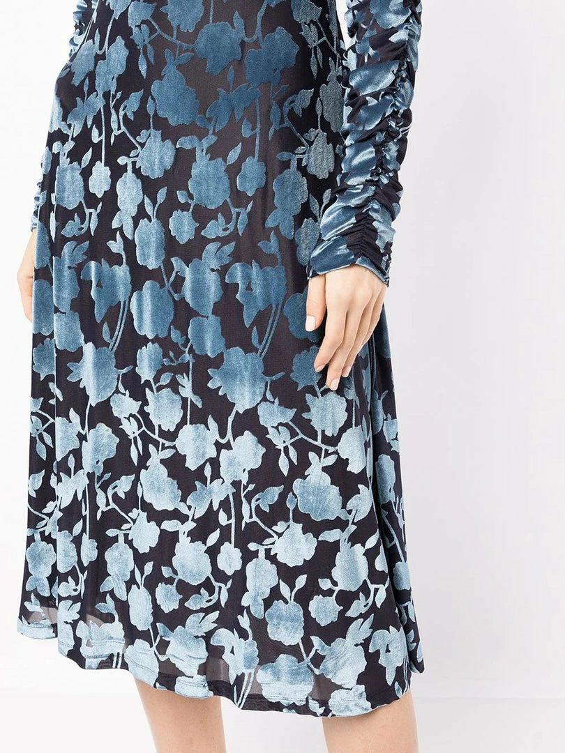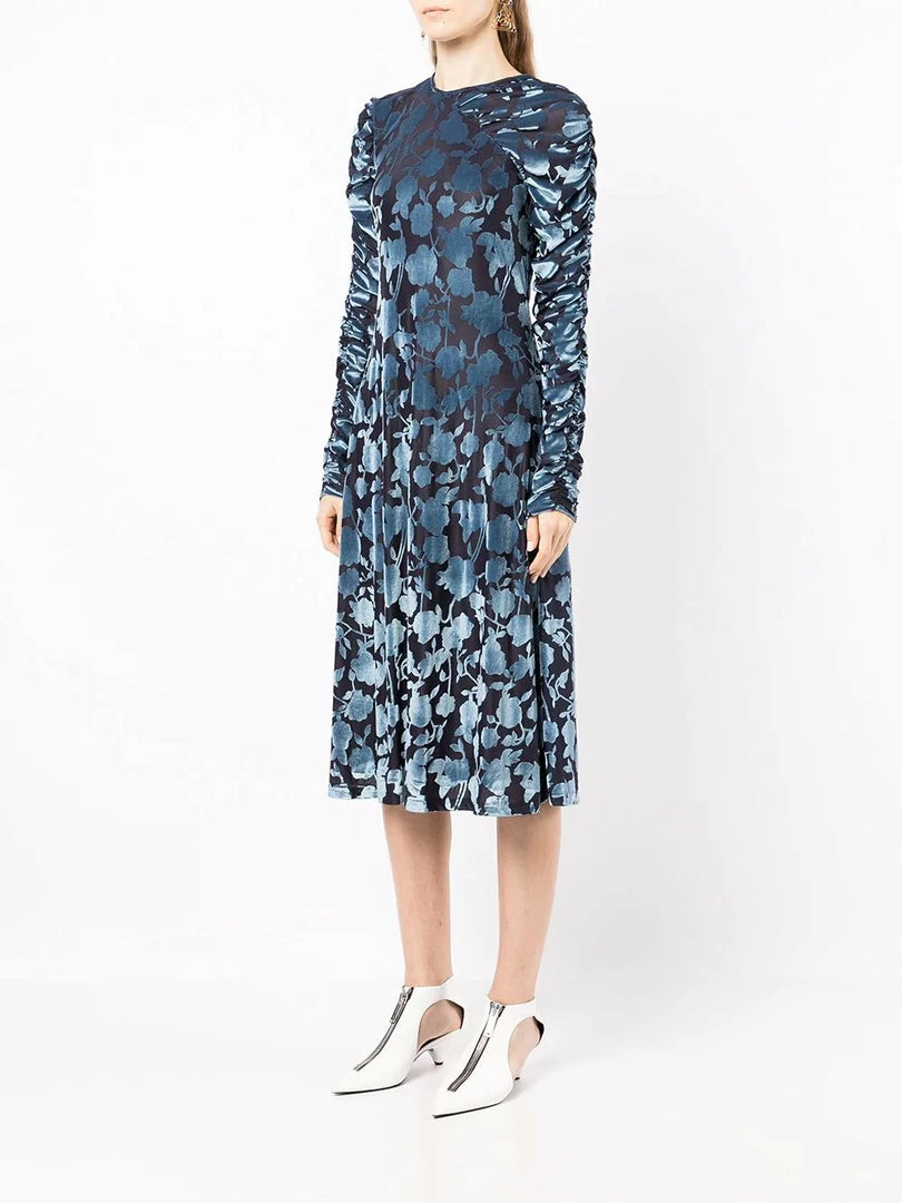 Stine Goya navy ‘Ellie’ floral velvet midi dress featuring a round neckline, asymmetrical long ruched elasticated sleeves, a blue velvet floral print on a sheer fabric, a midi length and pulls on. Item fits true to size. Model is wearing a size S.Â