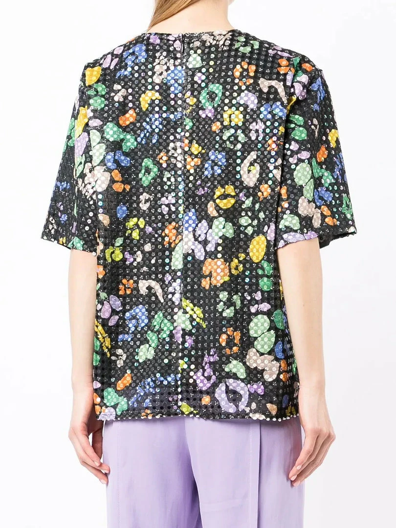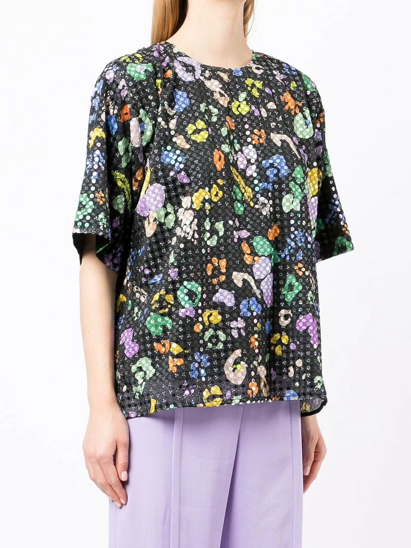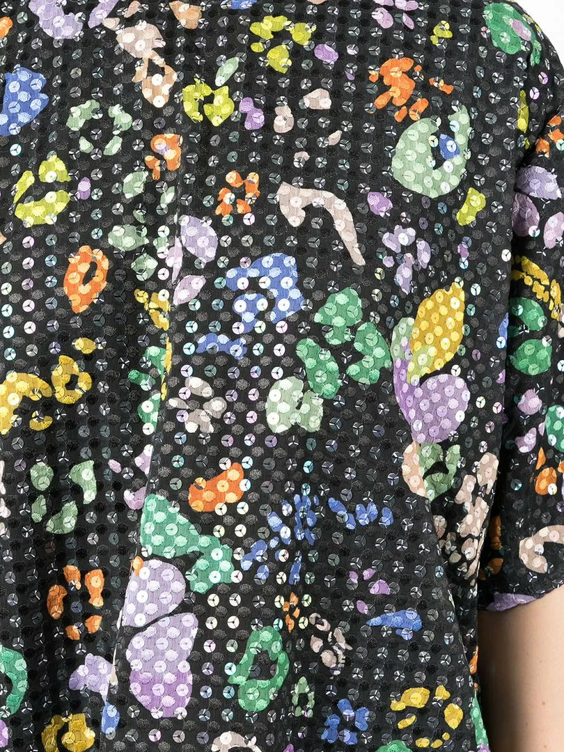 Stine Goya black oversized ‘Katalindi’ sequin leopard T-shirt featuring a round neckline, a back zip, hook and eye fastening, short sleeves, a multicoloured leopard print, round iridescent sequin and embroidered details and a boxy fit. Model is wearing a size XS.Â