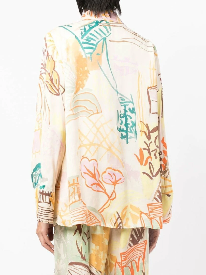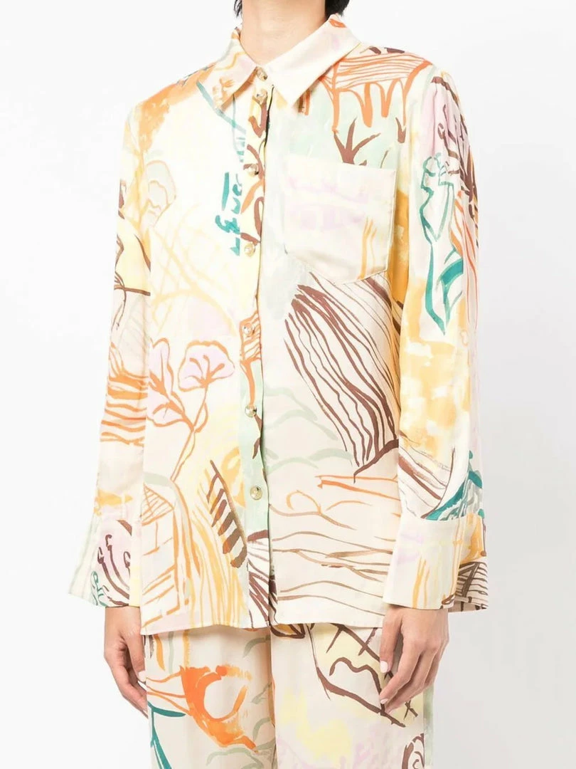 Stine Goya cream ‘Summer’ printed shirt featuring a classic collar, front button fastenings, long sleeves, a front chest patch pocket and a multicoloured Picasso style print. Item fits true to size. Model is wearing a size S.Â