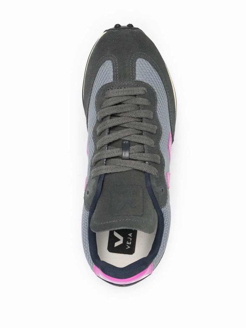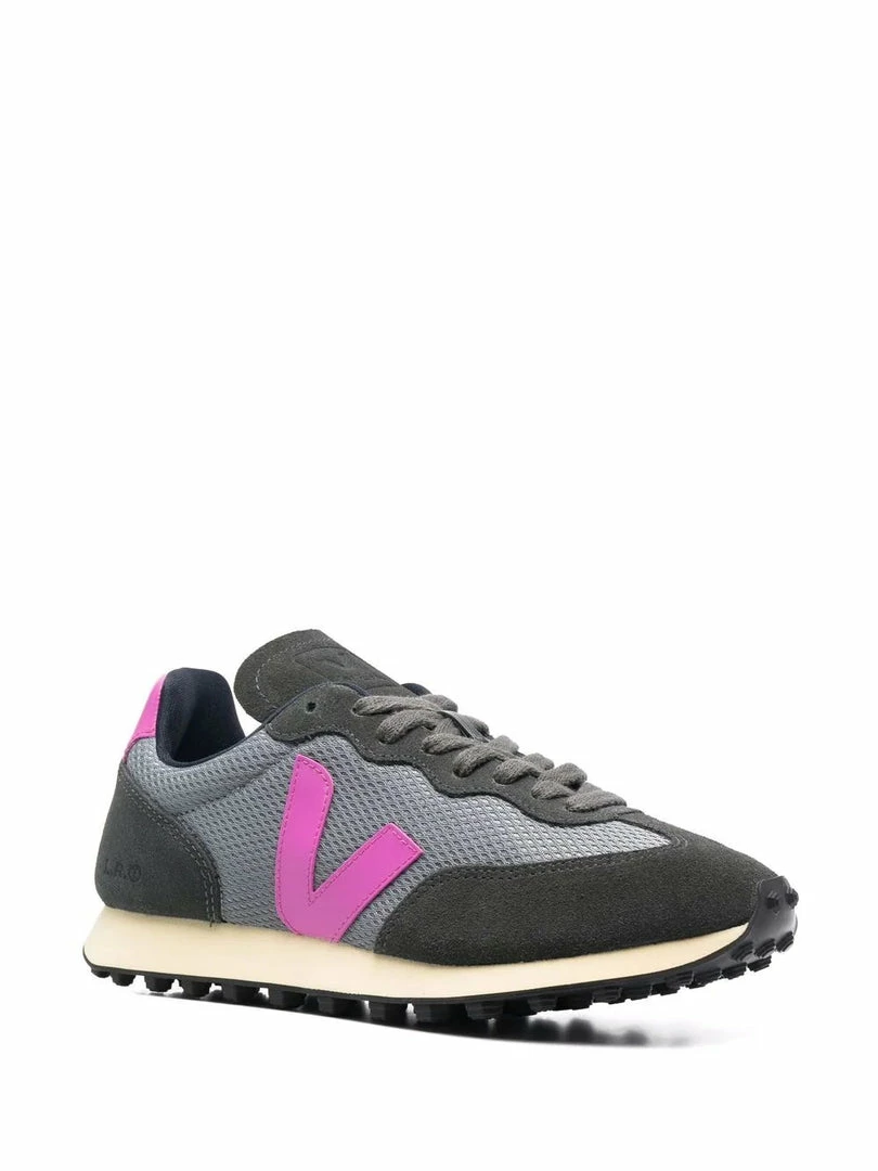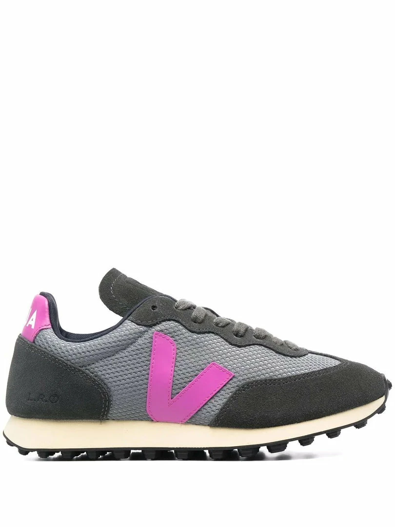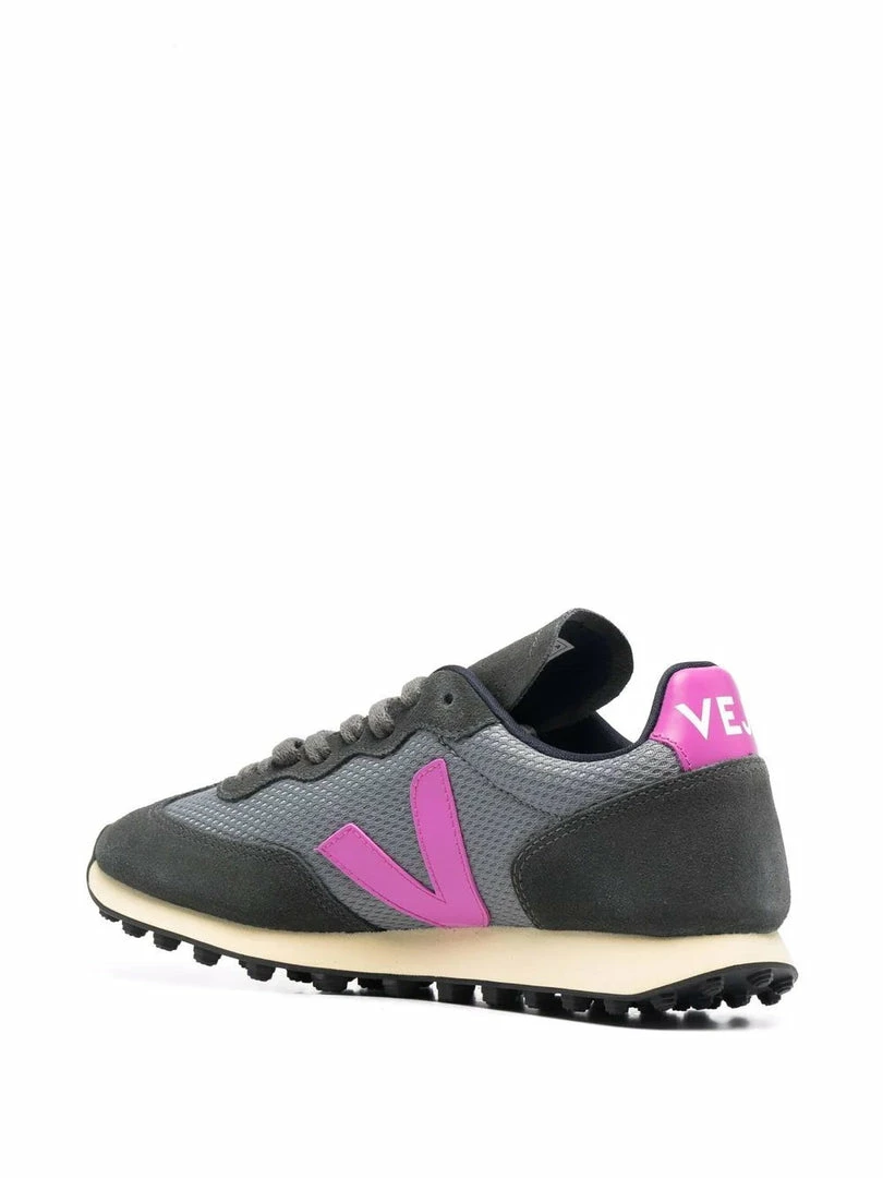 Veja concrete grey ‘Rio Branco’ suede trainers featuring a round toe, a front lace-up fastening, mesh side panels, violet signature ‘V’ details on the sides, an embossed branded logo on the tongue and a violet branded heel counter. Item fits true to size. European Sizing. Made in Brazil.