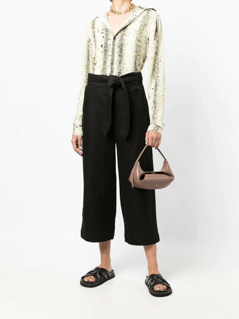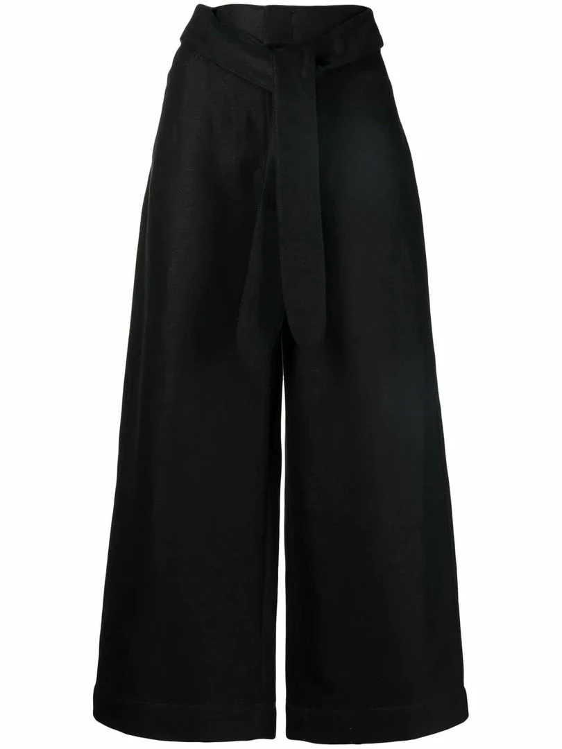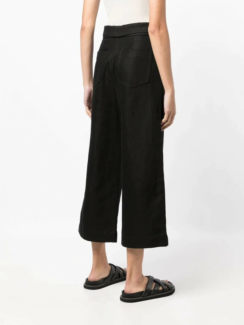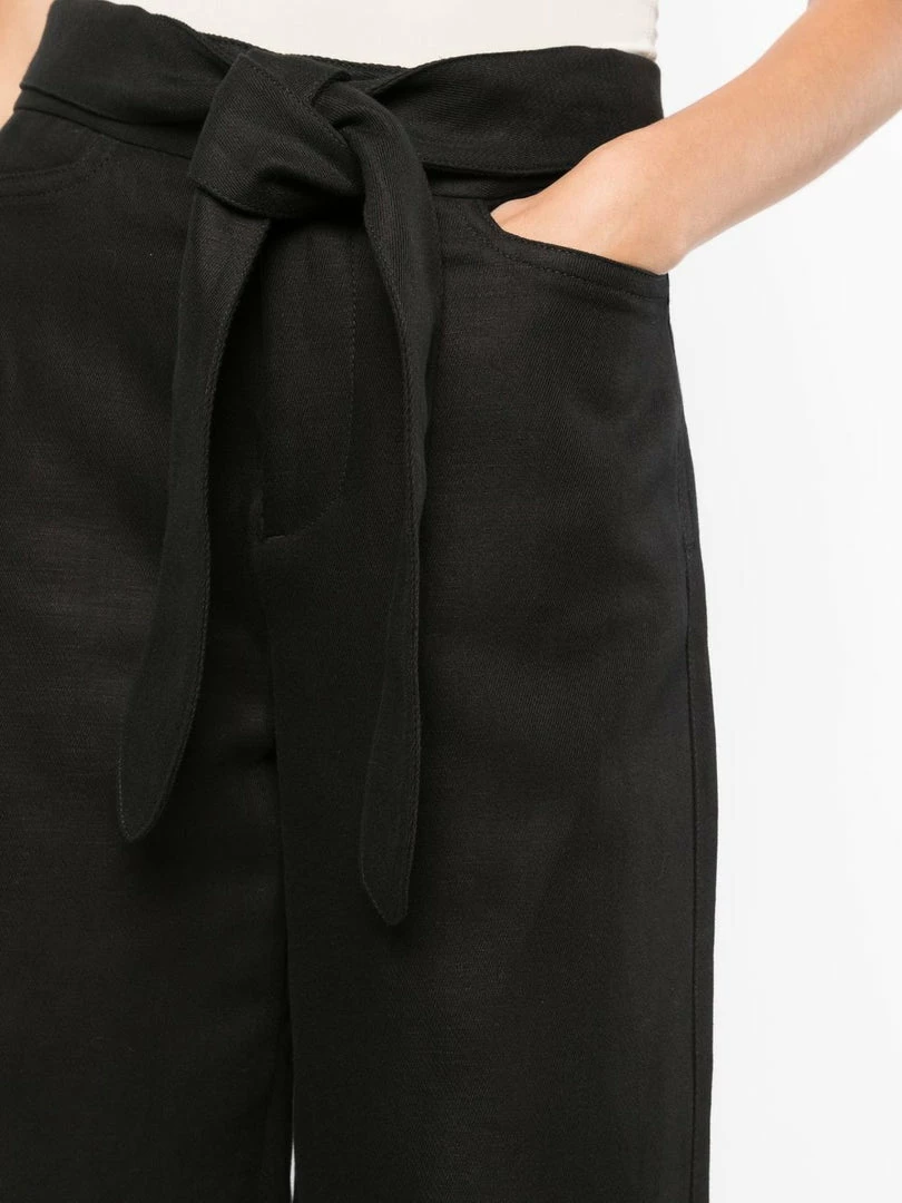 Vince black ‘Tie Front Wide Leg Trousers’ featuring front hook and zip fastenings, a fold-over tie front detail, a four pocket design, a cropped wide leg fit and a high rise style. Item fits true to size. Model is wearing a size 4 US.Â