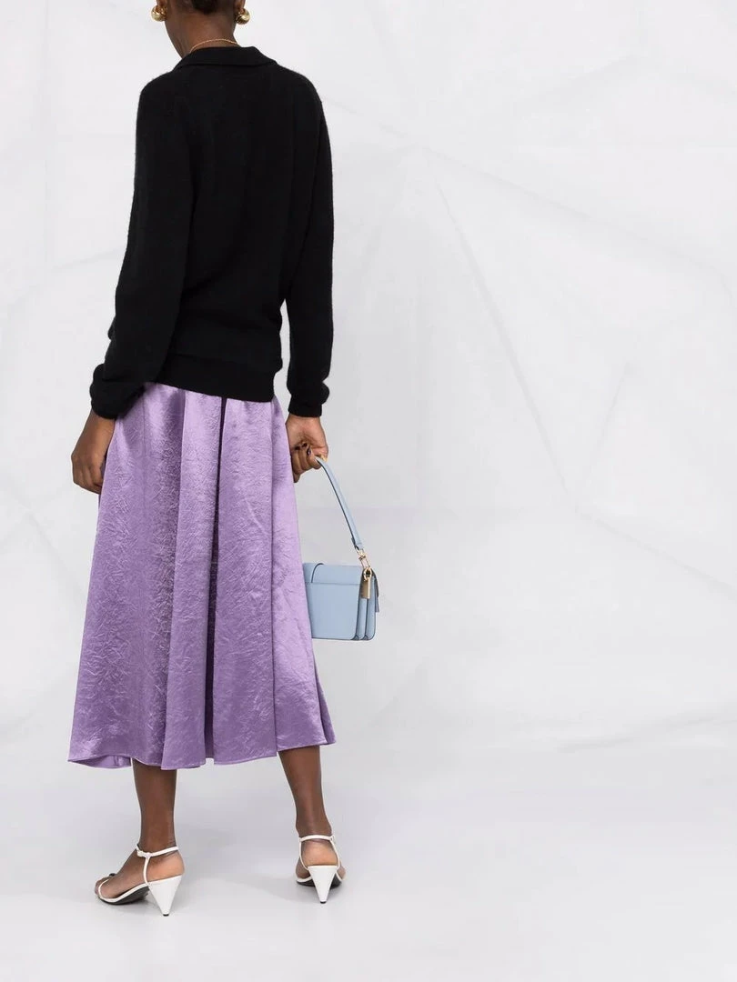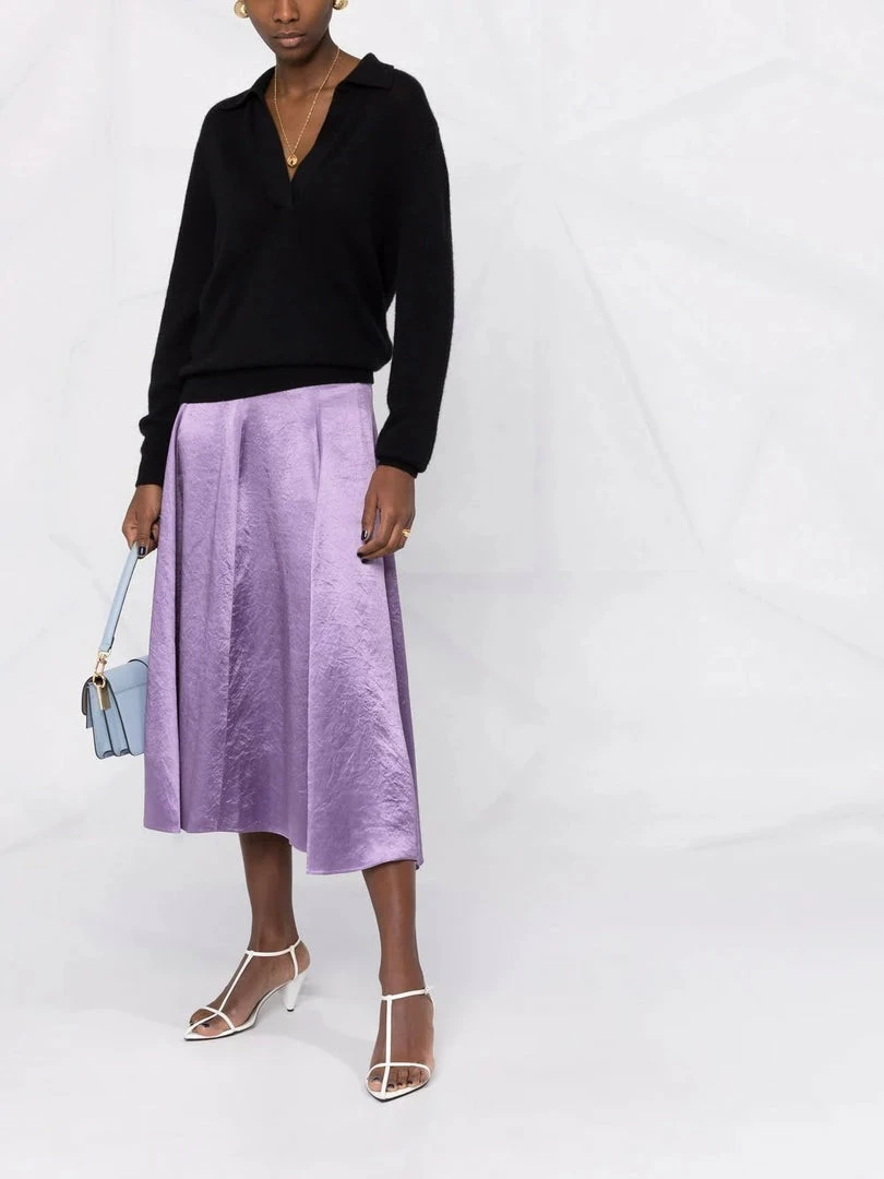 Vince purple ‘Panelled Satin Slip Midi Skirt’ featuring a back zip fastening, an A-line shape, a high waist style and a midi length. Item fits true to size. Model is wearing a size 4 US.Â