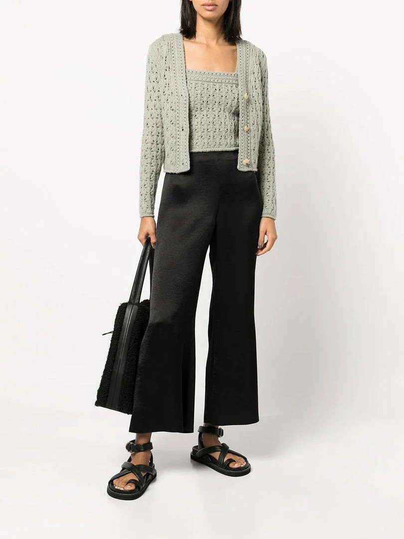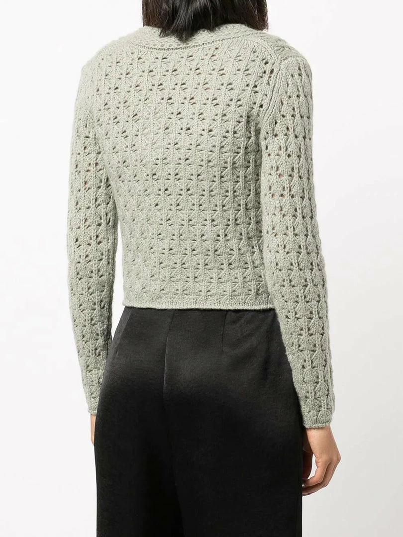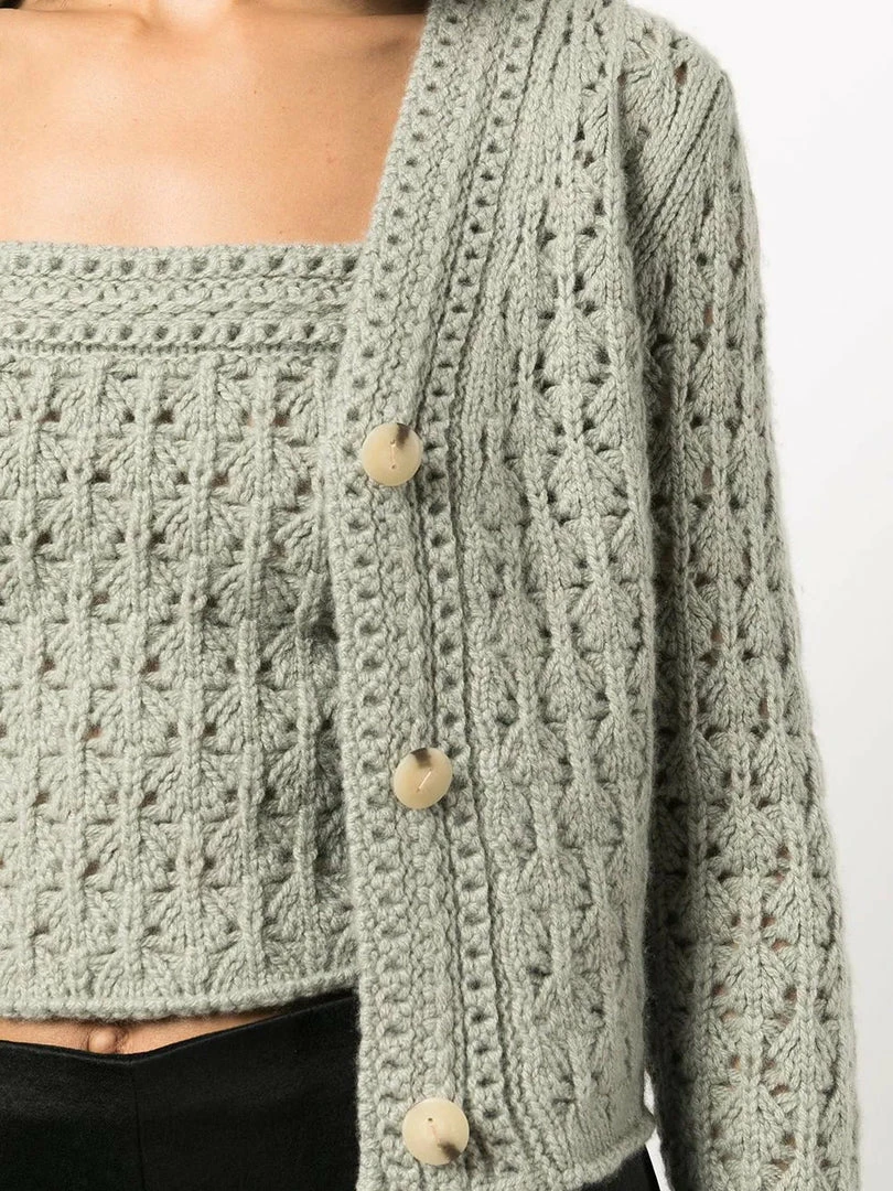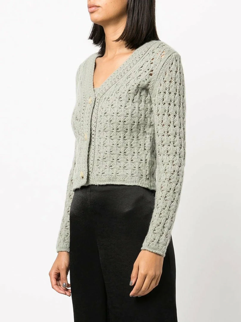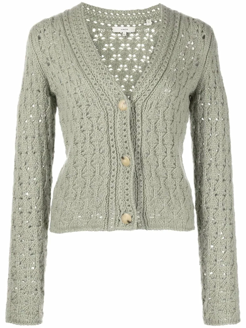 Vince artichoke green ‘Crochet Knit Cardigan’ featuring a V-neckline, front button fastenings, long sleeves and a crochet knit. Item fits true to size. Model is wearing a size S.