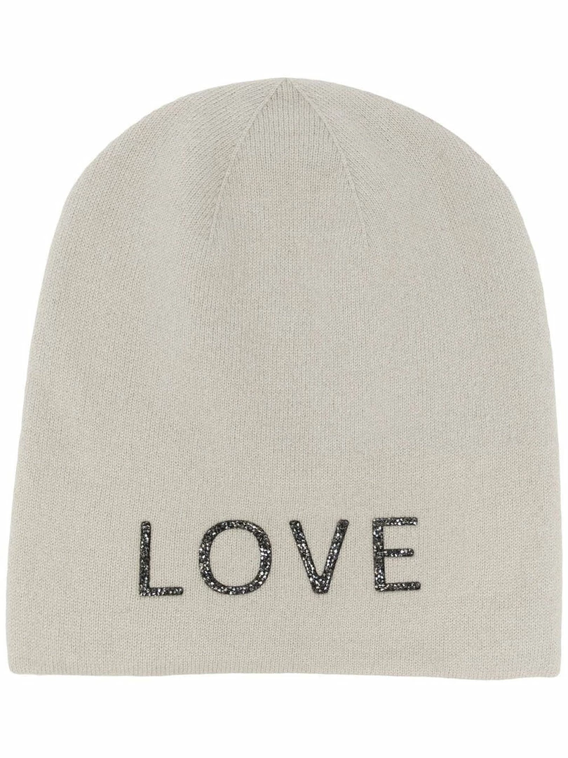 Warm-Me light grey handmade cashmere ‘Damian Love Black Crystal Hat’ featuring a front ‘Love’ design embellished with black Swarovski crystals, a pull on style and a slouchy fit. Made in Nepal. One Size.
