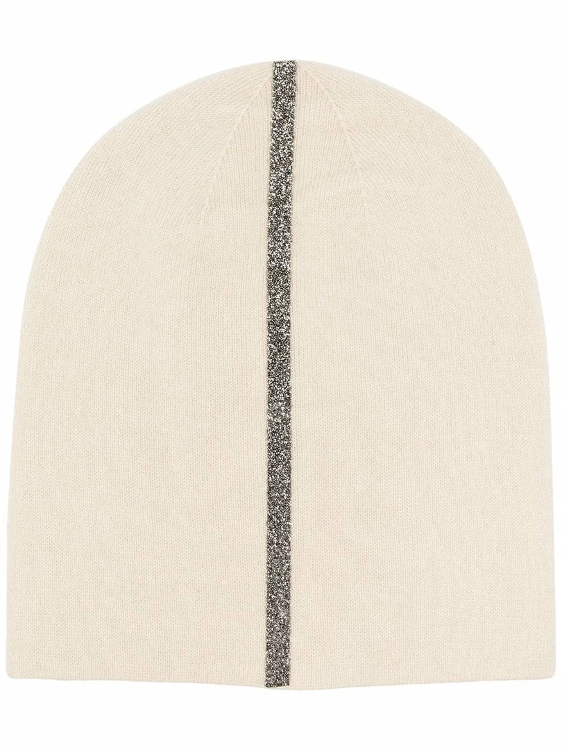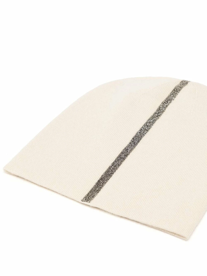 Warm-Me white handmade cashmere ‘Damian Stripe Hat’ featuring a front stripe design embellished with silver Swarovski crystals, a pull on style and a slouchy fit. Made in Nepal. One Size.