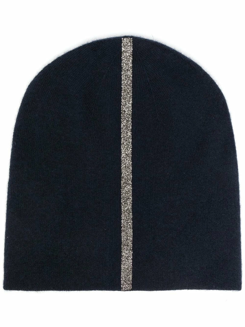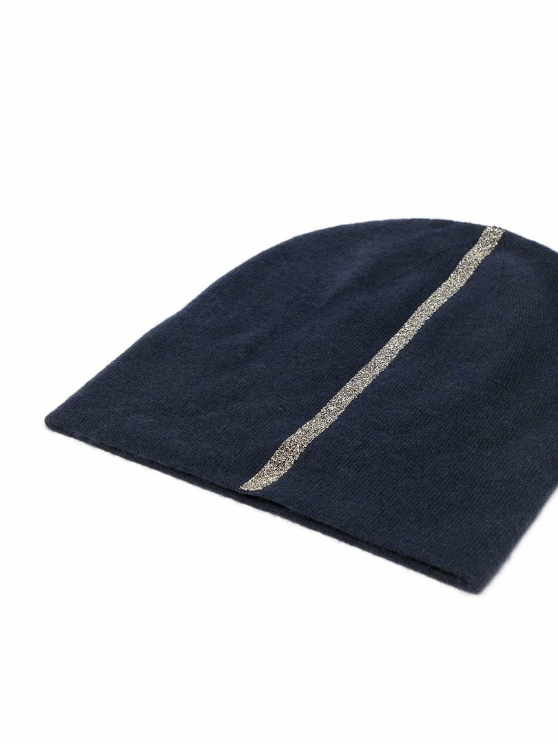Warm-Me navy handmade cashmere ‘Damian Stripe Hat’ featuring a front stripe design embellished with silver Swarovski crystals, a pull on style and a slouchy fit. Made in Nepal. One Size.Â