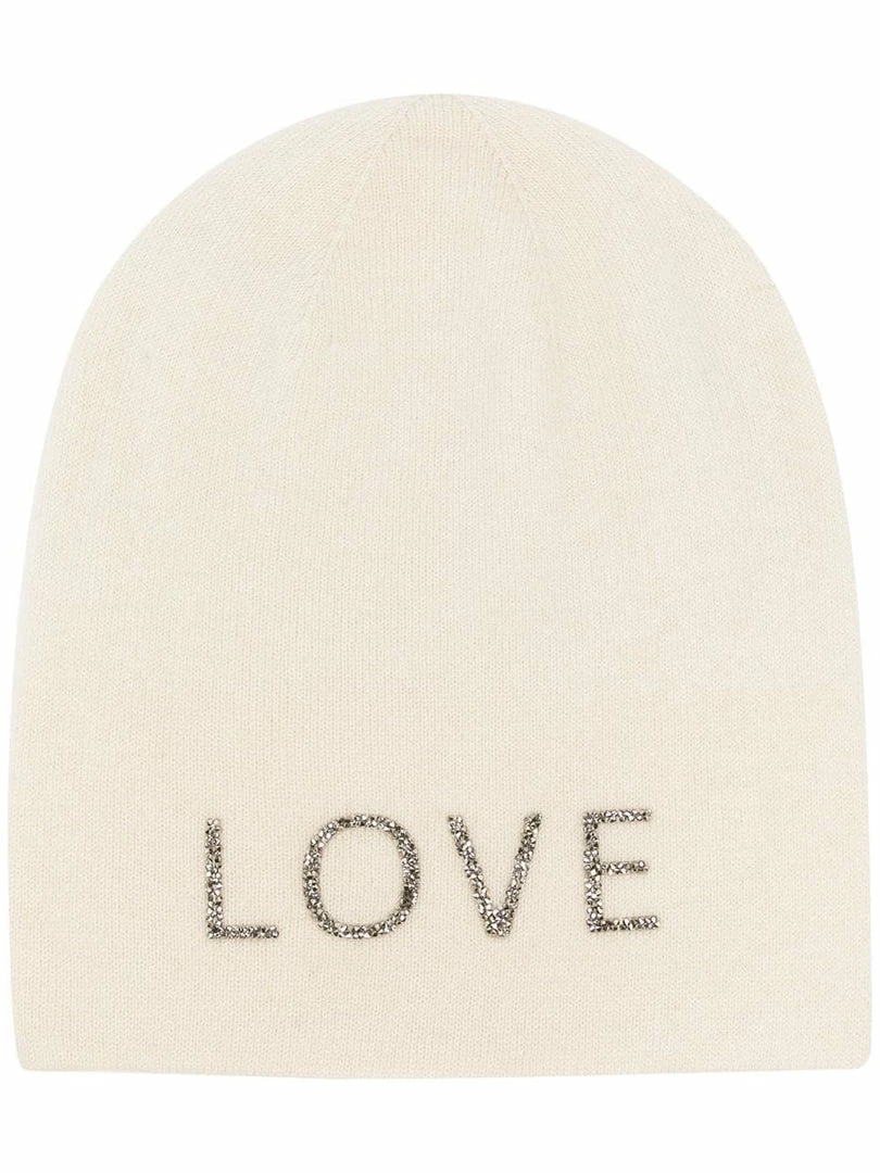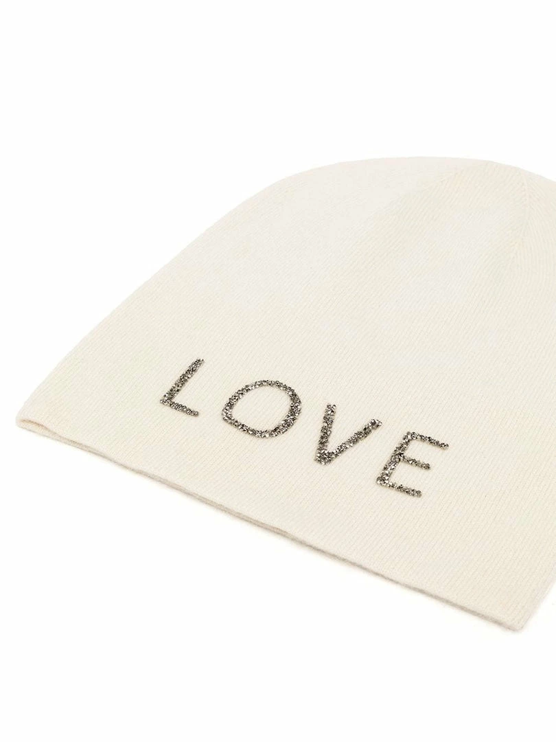 Warm-Me white handmade cashmere ‘Damian Love Silver Crystal Hat’ featuring a front ‘Love’ design embellished with silver Swarovski crystals, a pull on style and a slouchy fit. Made in Nepal. One Size.