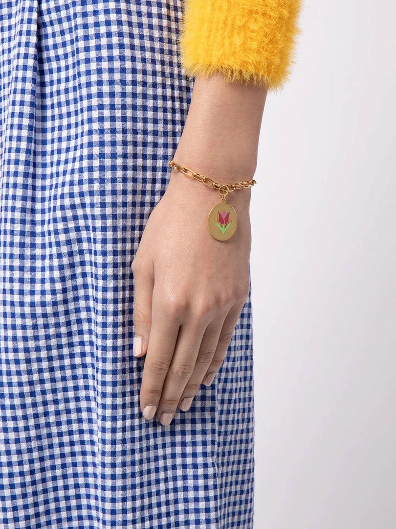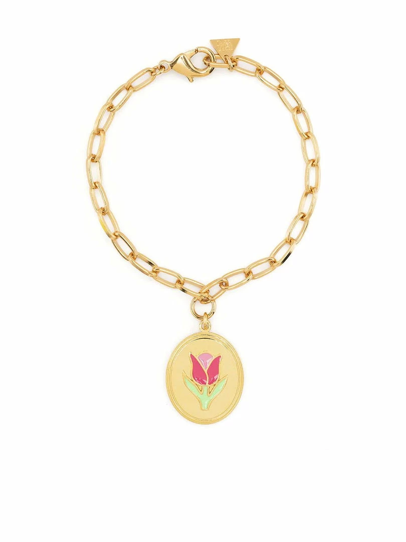 Wilhelmina Garcia ‘Pink Tulip Charm Bracelet’ featuring an oval pink and green tulip pendant, a chunky chain design, a lobster clasp fastening and gold tone hardware. Chain is 20cm. Made in Spain.