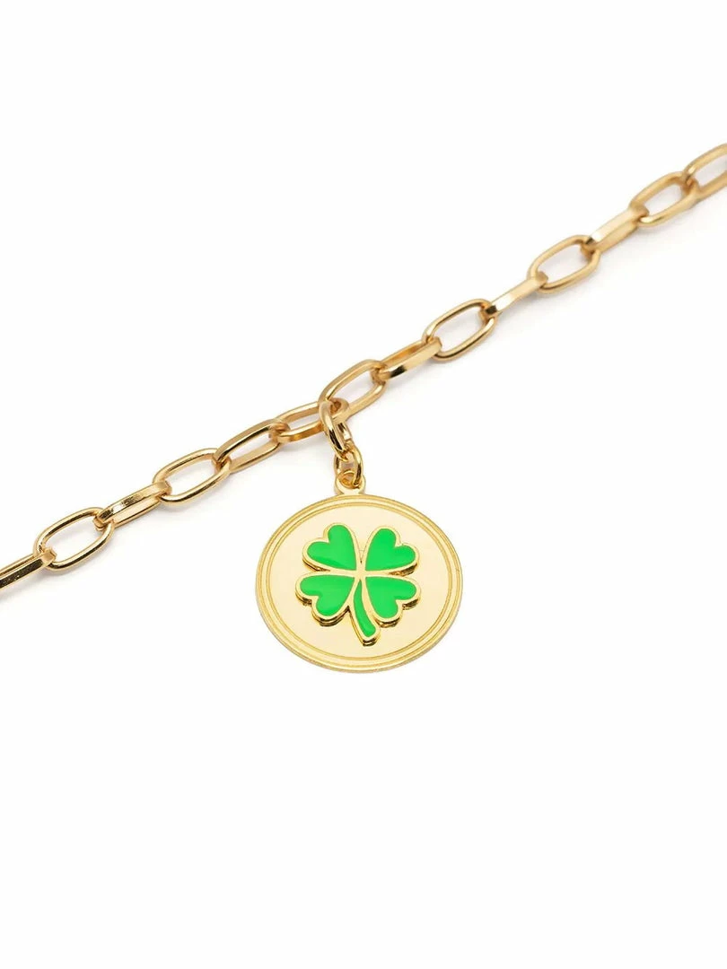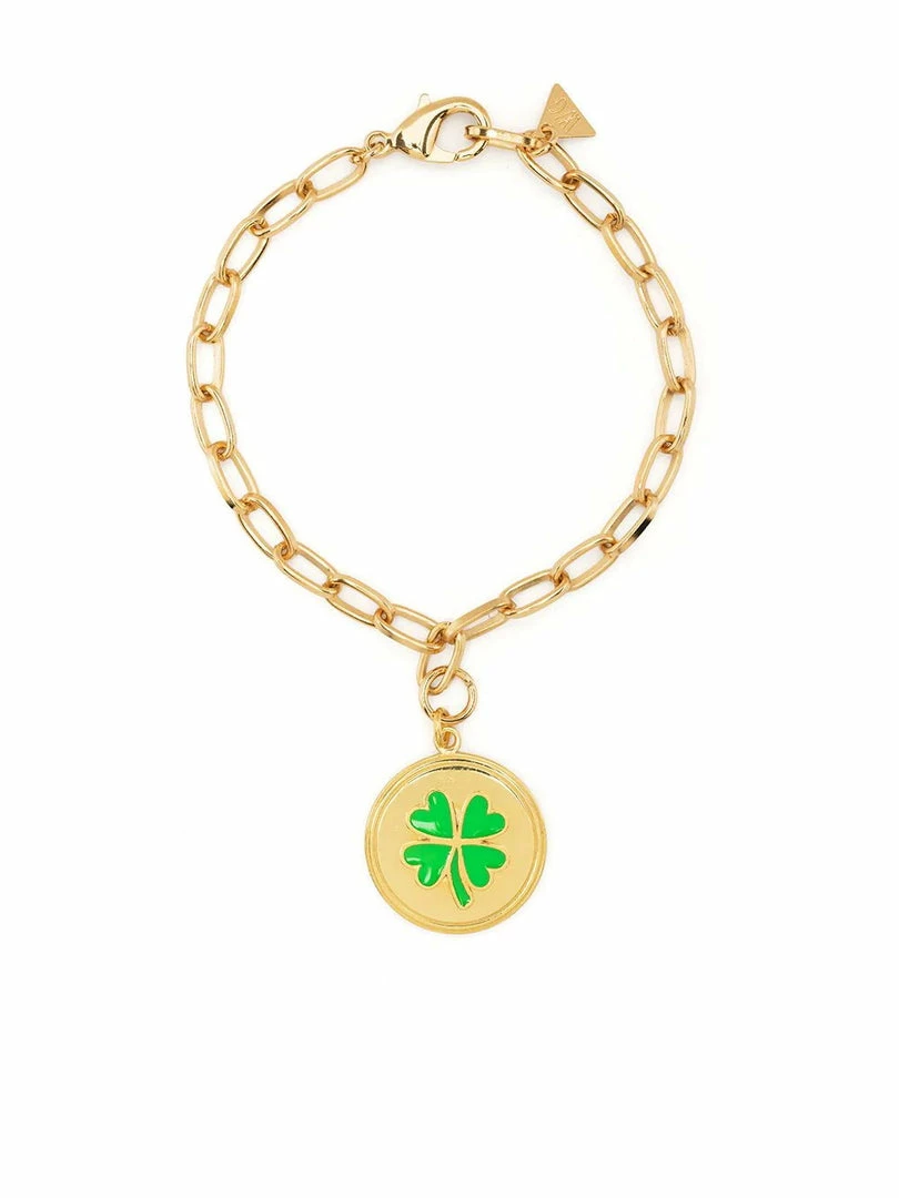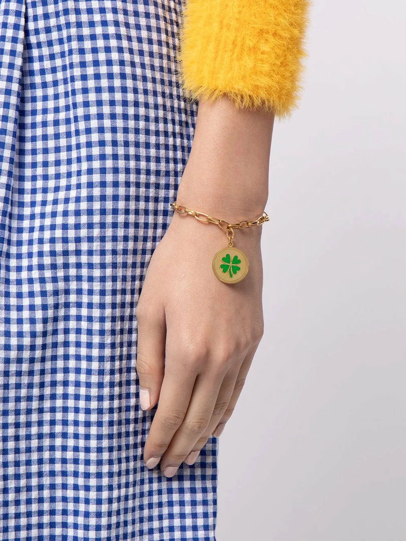 Wilhelmina Garcia ‘Lucky Clover Charm Bracelet’ featuring a round green four leaf clover pendant, a chunky chain design, a lobster clasp fastening and gold tone hardware. Chain is 20cm. Made in Spain.
