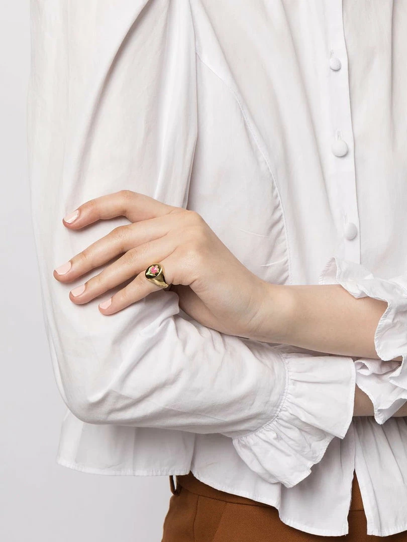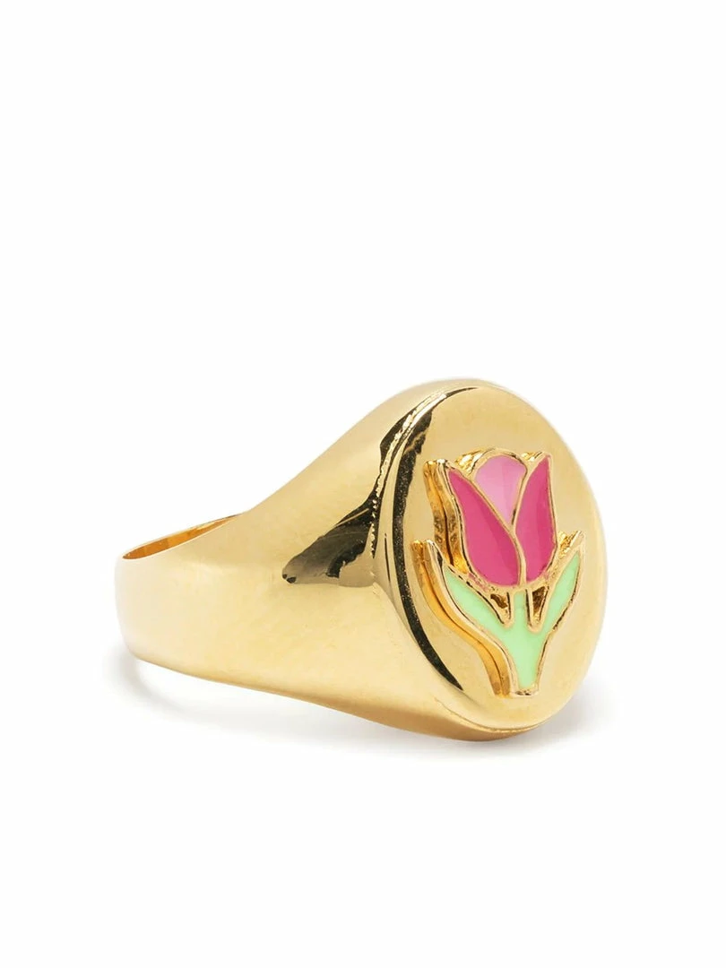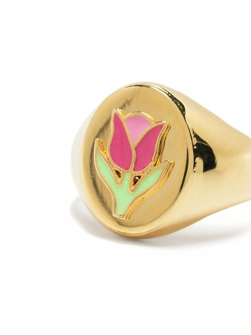 Wilhelmina Garcia ‘Pink Tulip Ring’ featuring a round frame, a pink and green tulip design, gold tone hardware and slips on. Item is EU ring sizing. Made in Spain.