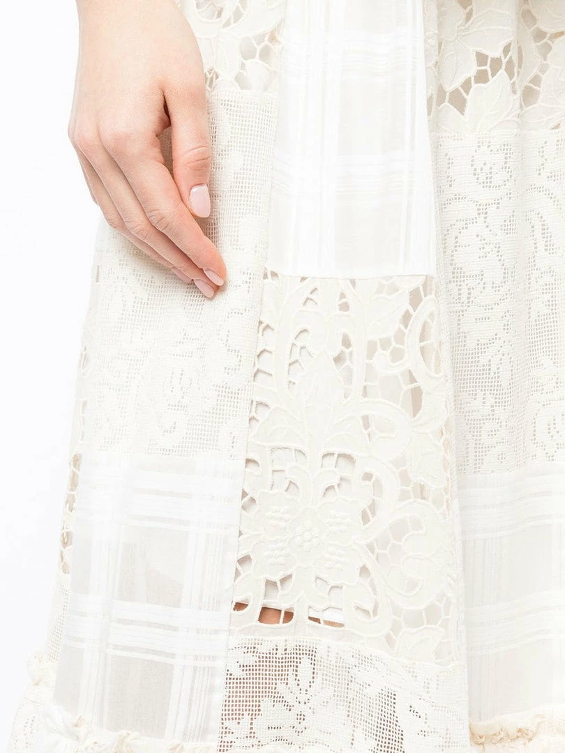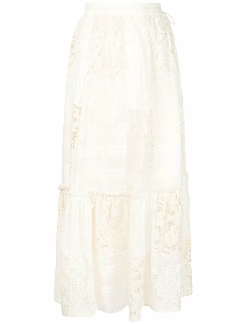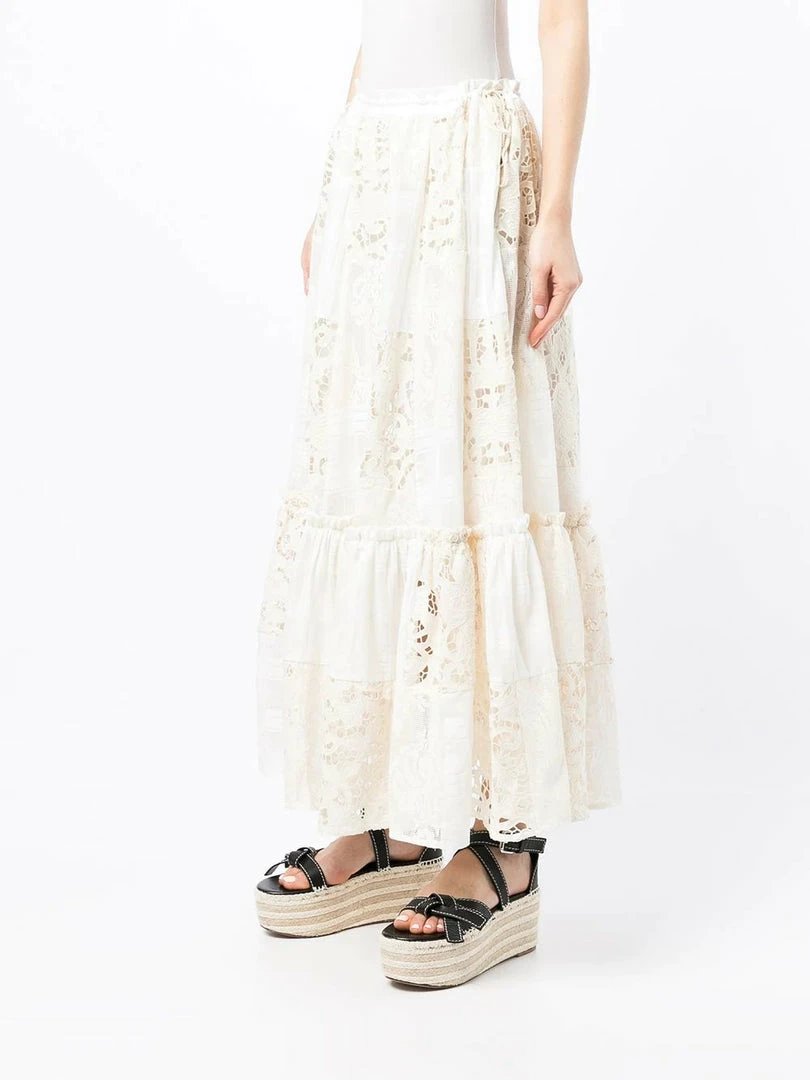 Zimmermann white ‘Andie Tie Midi Skirt’ featuring a drawstring waist with a rope tie fastening, side button closures, cream patchwork embroidered lace details and a midi length. Item fits true to size. Model is wearing a size 0 AU.Â