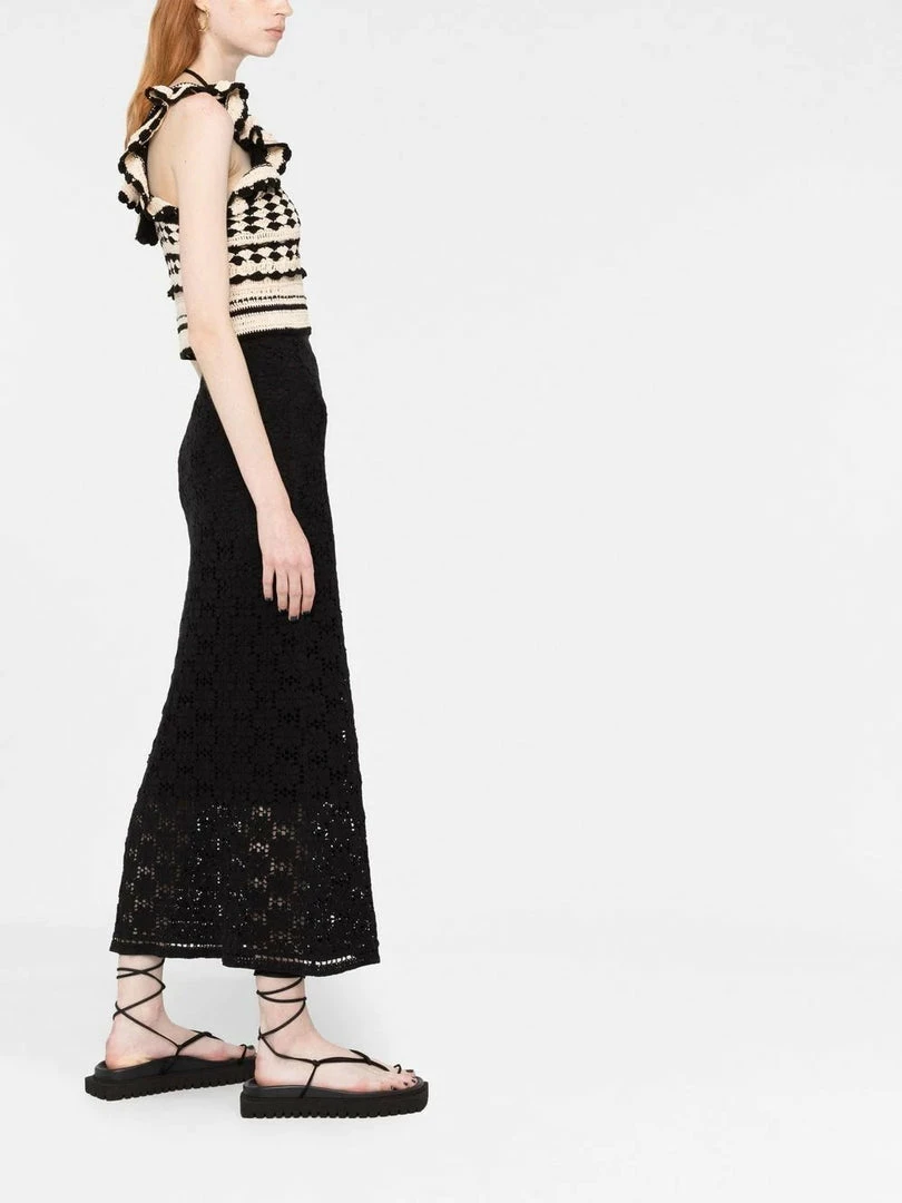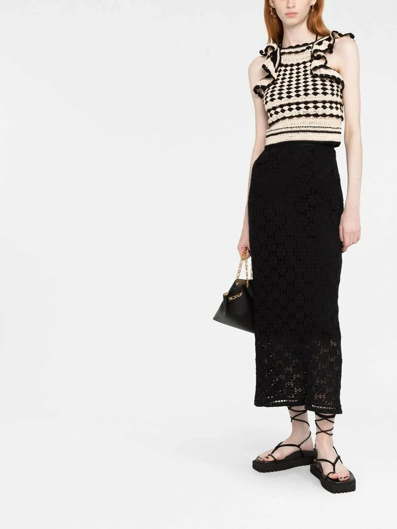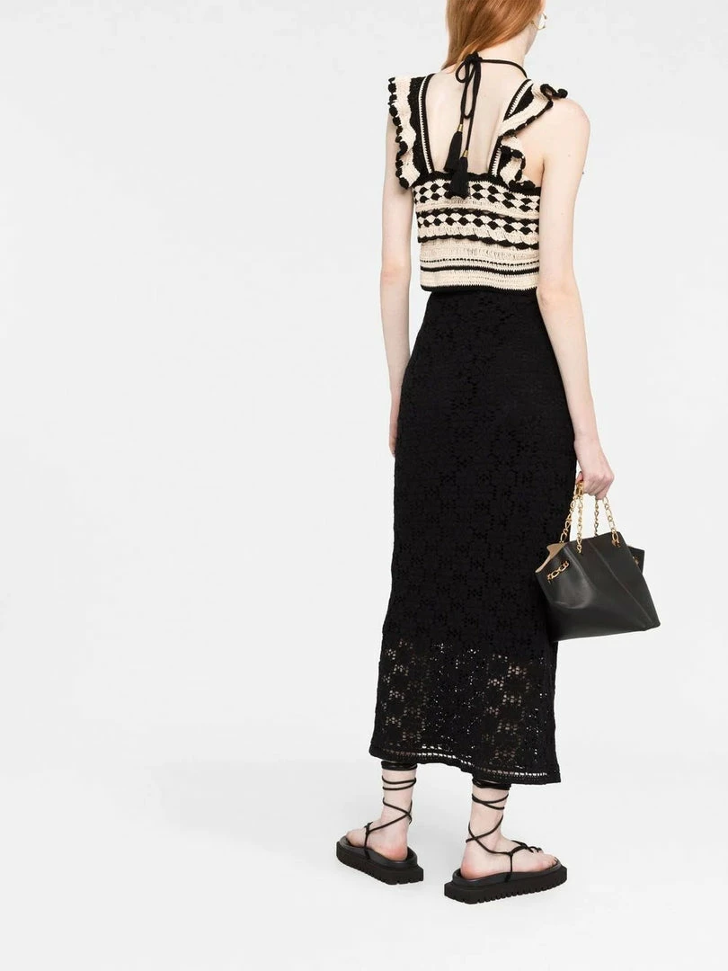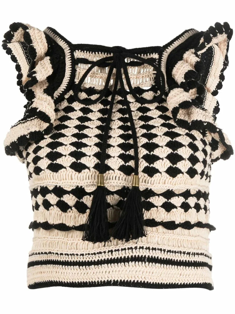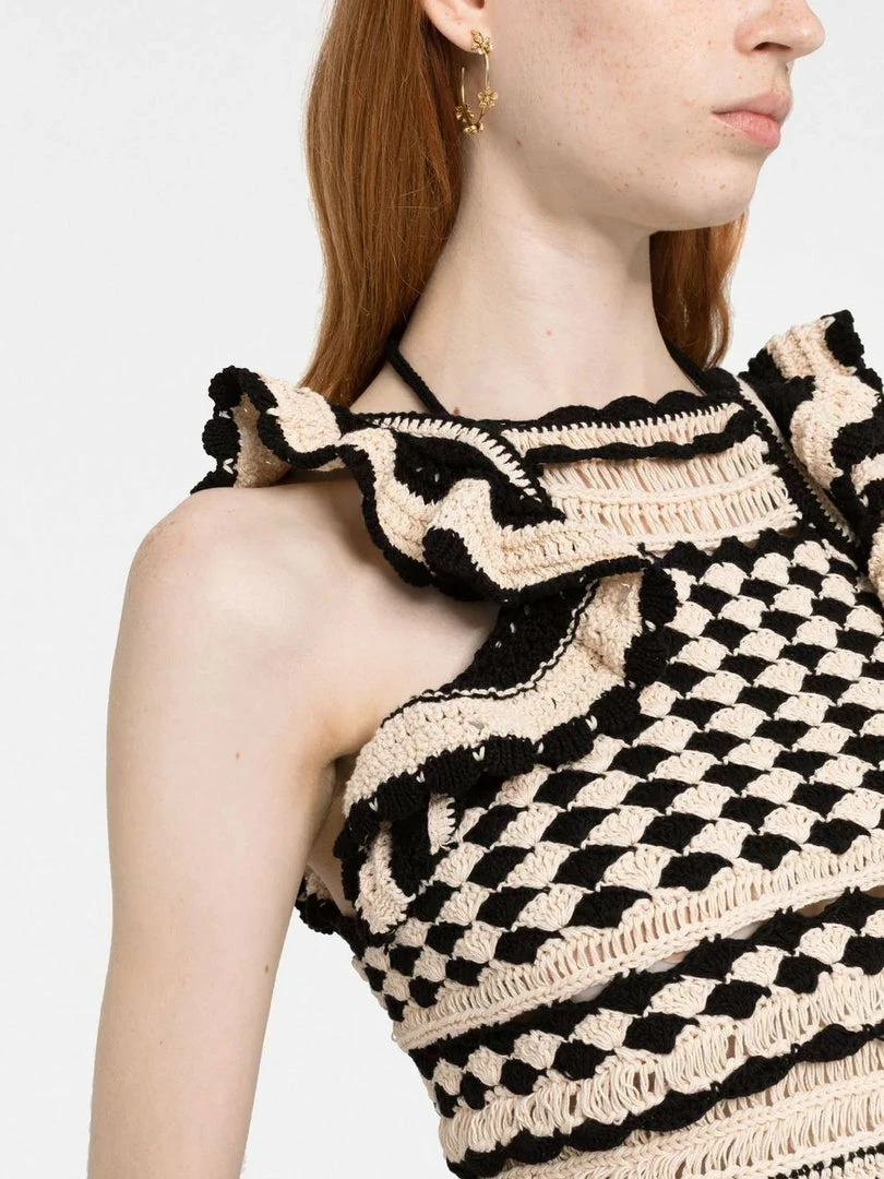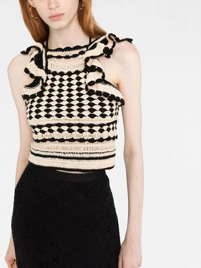 Zimmermann black and cream ‘Anneke Crochet Halterneck Tank Top’ featuring a tie fastening, ruffled details and a cropped fit. Item fits true to size. Model is wearing a size 0 AU.Â