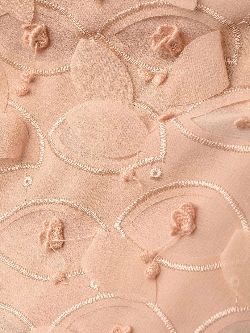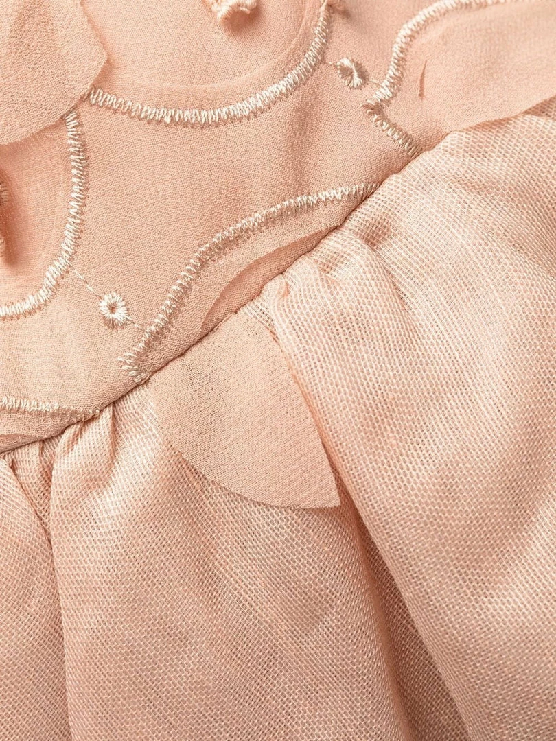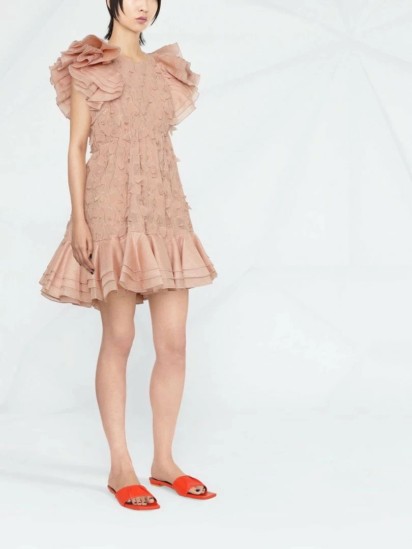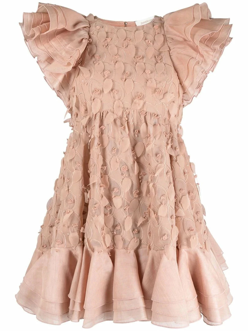 Zimmermann blush pink ‘Dancer Frilled Mini Dress’ featuring a round neck, 3-D applique detailing, a tiered frilled top and hem, an open back with a button and loop fastening, a back zip closure and a slightly sheer design. Item fits true to size. Model is wearing a size 0 AU.