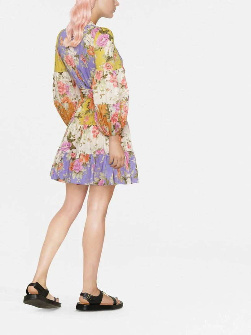 Zimmermann ‘Pattie’ mini dress featuring a v-neckline, a wrapped style with a tie fastening, long sleeves with elasticated cuffs, a multicoloured floral print and a short length. Item fits true to size. Model is wearing a size 0.Â