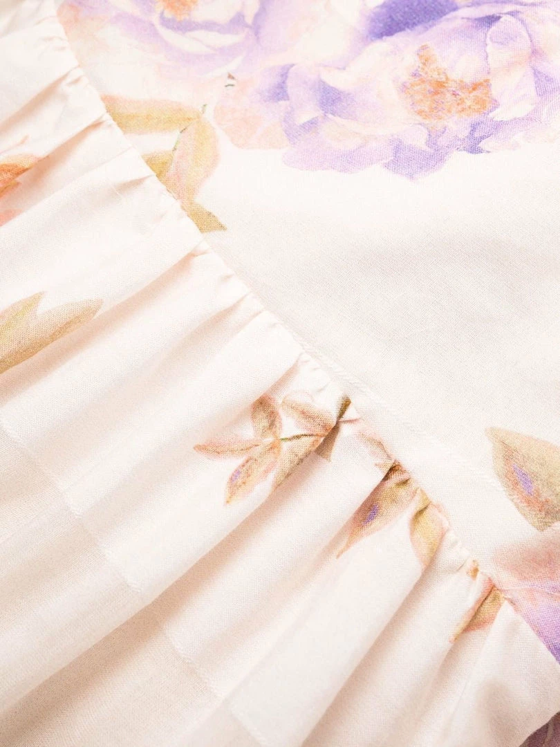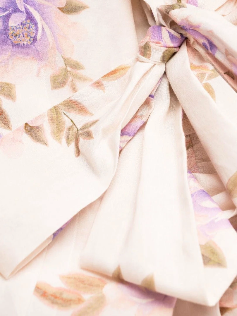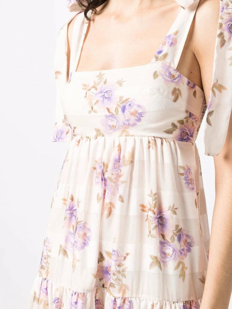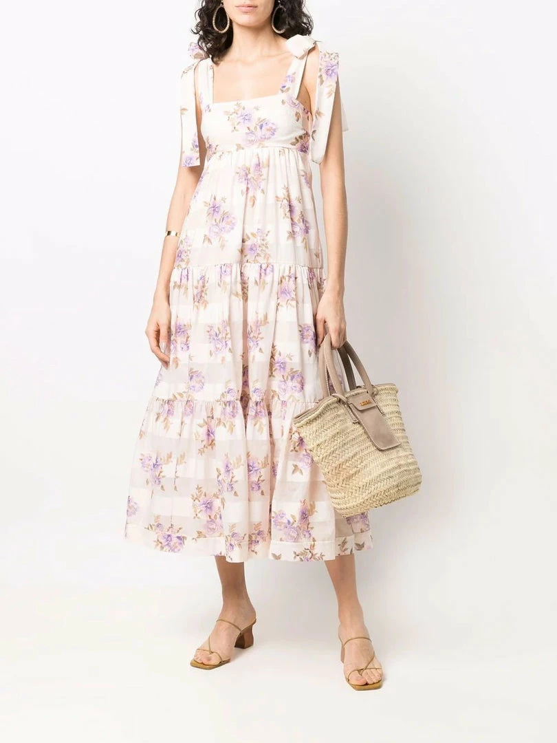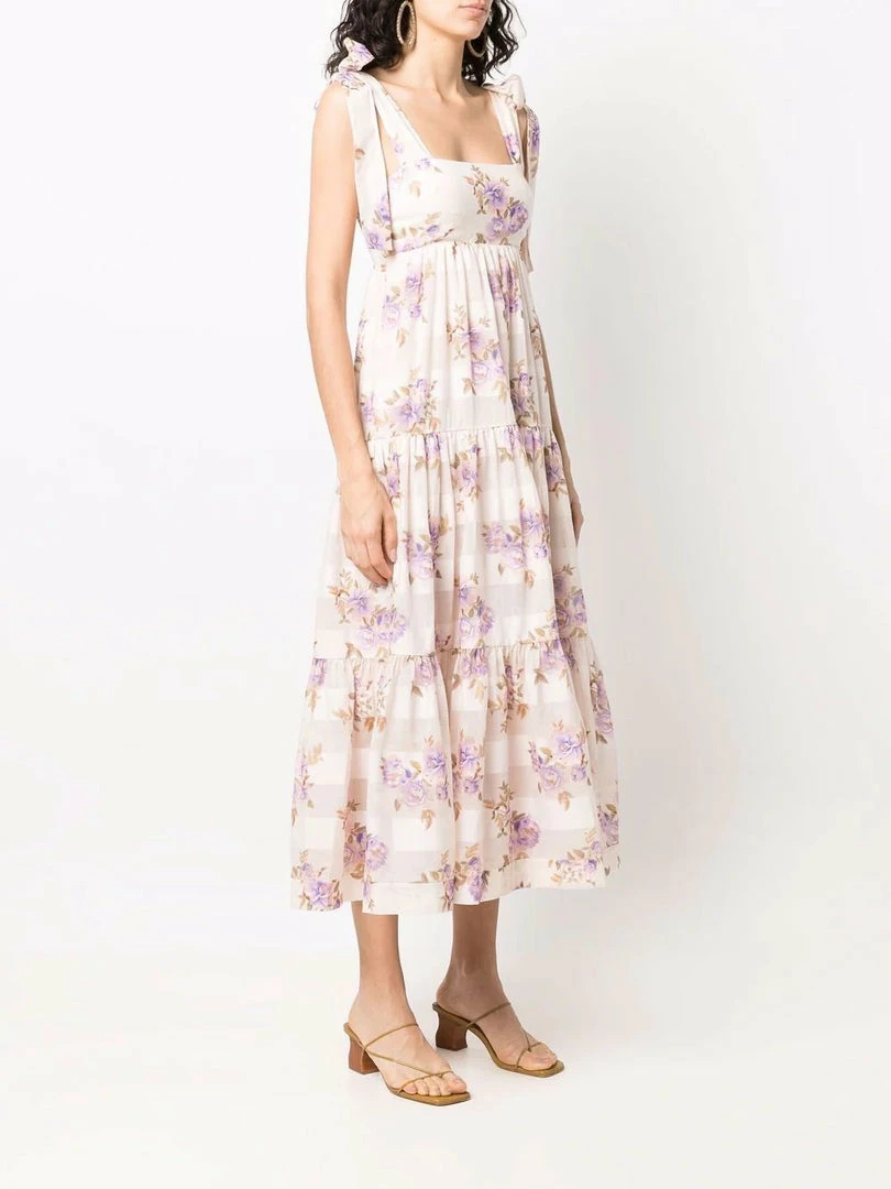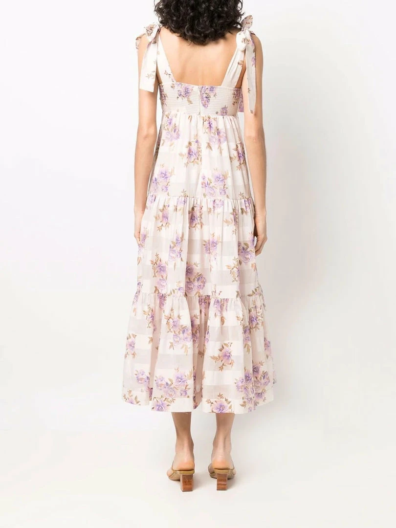 Zimmermann light pink ‘Rosa Striped Picnic Dress’ featuring adjustable tie straps, a straight neckline, a shirred back panel, a back zip fastening, an empire waistline, a tiered skirt, a sheer stripe and multicoloured floral print and a midi length. Item fits true to size. Model is wearing a size 0 AU.